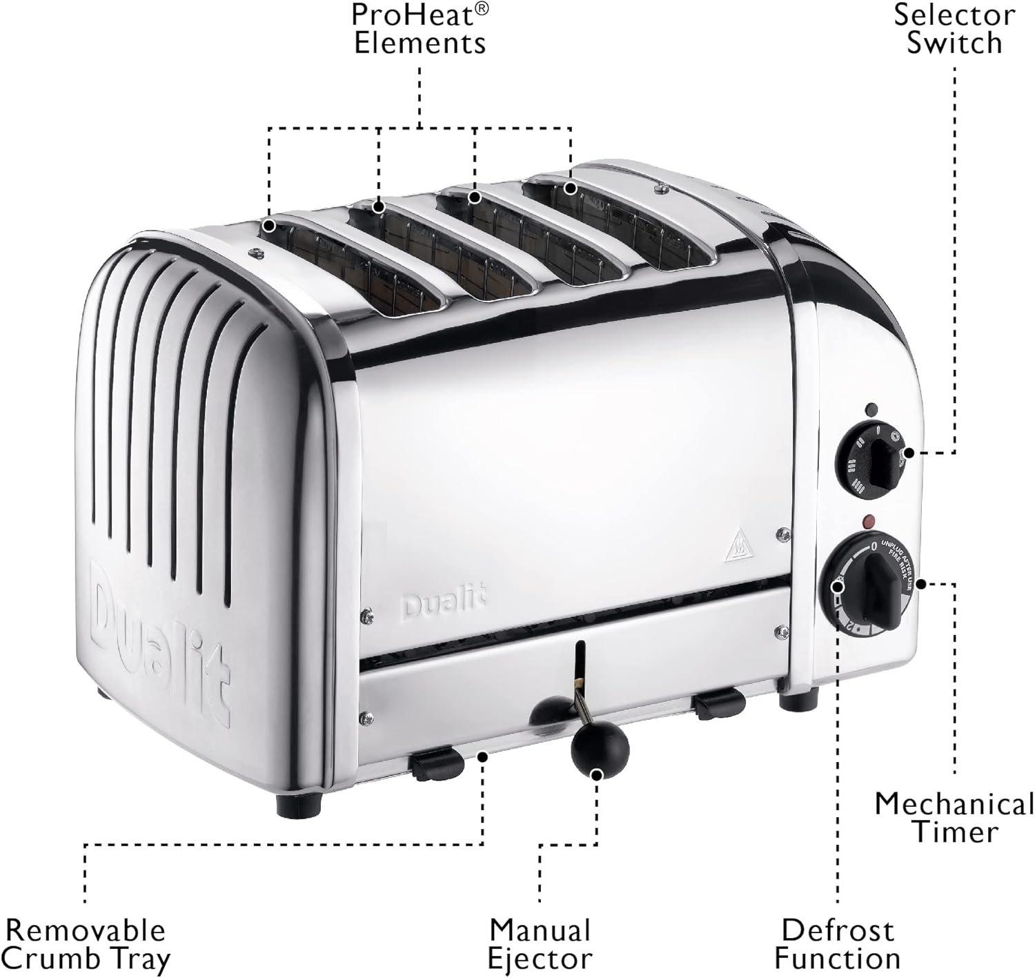 Dualit Classic 4 Slice NewGen Toaster - Stainless Steel - Hand Built in the UK - Replaceable ProHeat elements - Defrost Bread - Mechanical Timer - Polished Classic Toaster