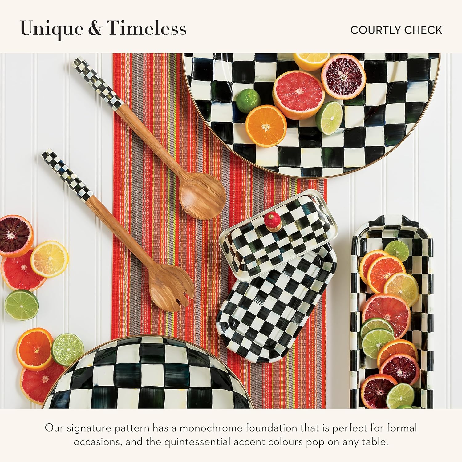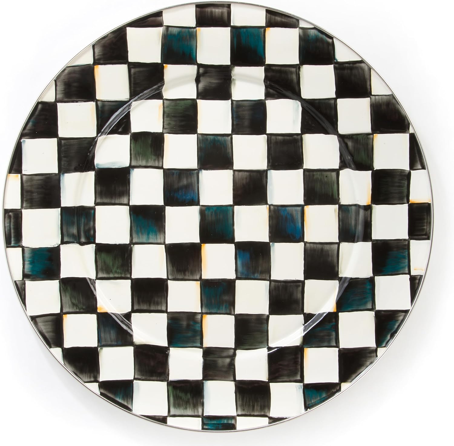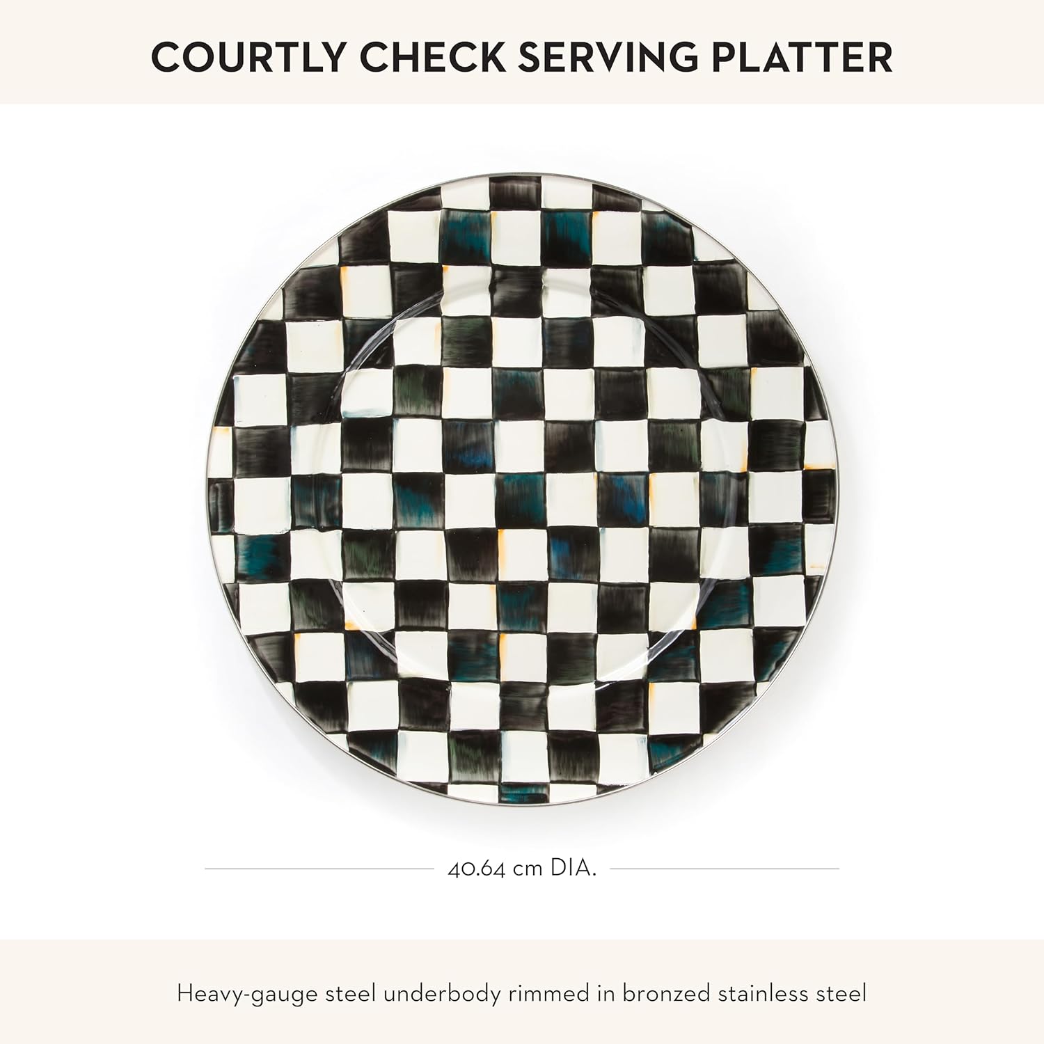 - ELEGANT SERVING PLATE: Serve in style with the Courtly Check Enamel Serving Platter. This decorative round-shaped platter is great for holidays or everyday events and features our signature black-and-white colour-dragged checks.