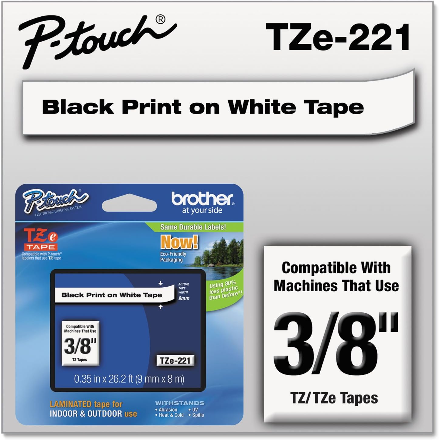 Brother(R) TZe-221 Black-On-White Tape, 0.38in. x 26.2ft., BRTTZ221