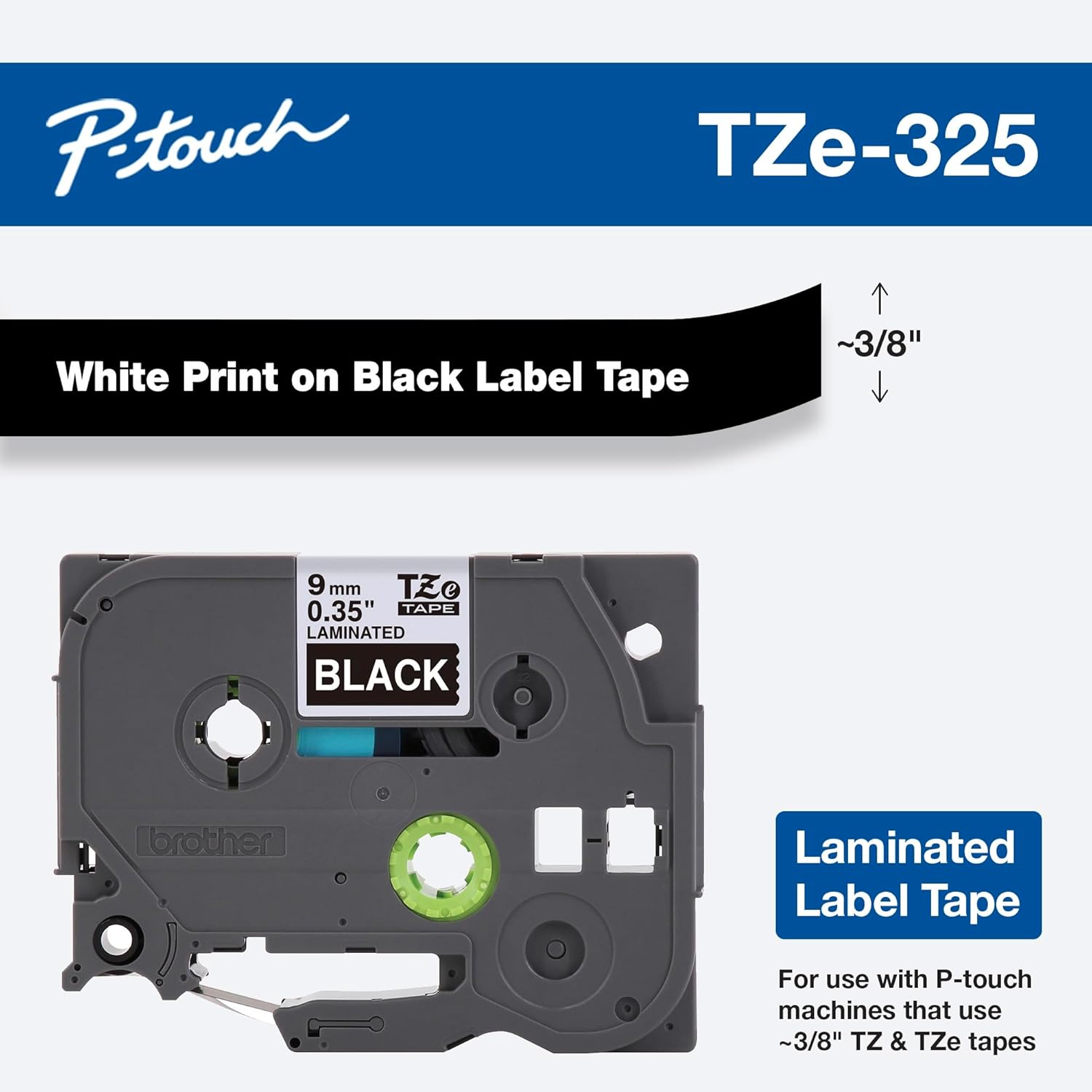Brother Genuine P-touch TZE-325 Tape, 3/8" (0.35") Wide Standard Laminated Tape, White on Black, Laminated for Indoor or Outdoor Use, Water-Resistant, 0.35" x 26.2' (9mm x 8M), Single-Pack, TZE325