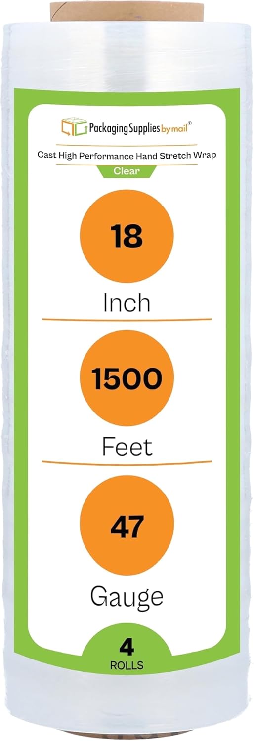 - SPECS - You will receive 4 rolls of clear stretch wrap. Each roll is 18 inch tall by 1,500 feet in length. Thickness is 47 gauge.