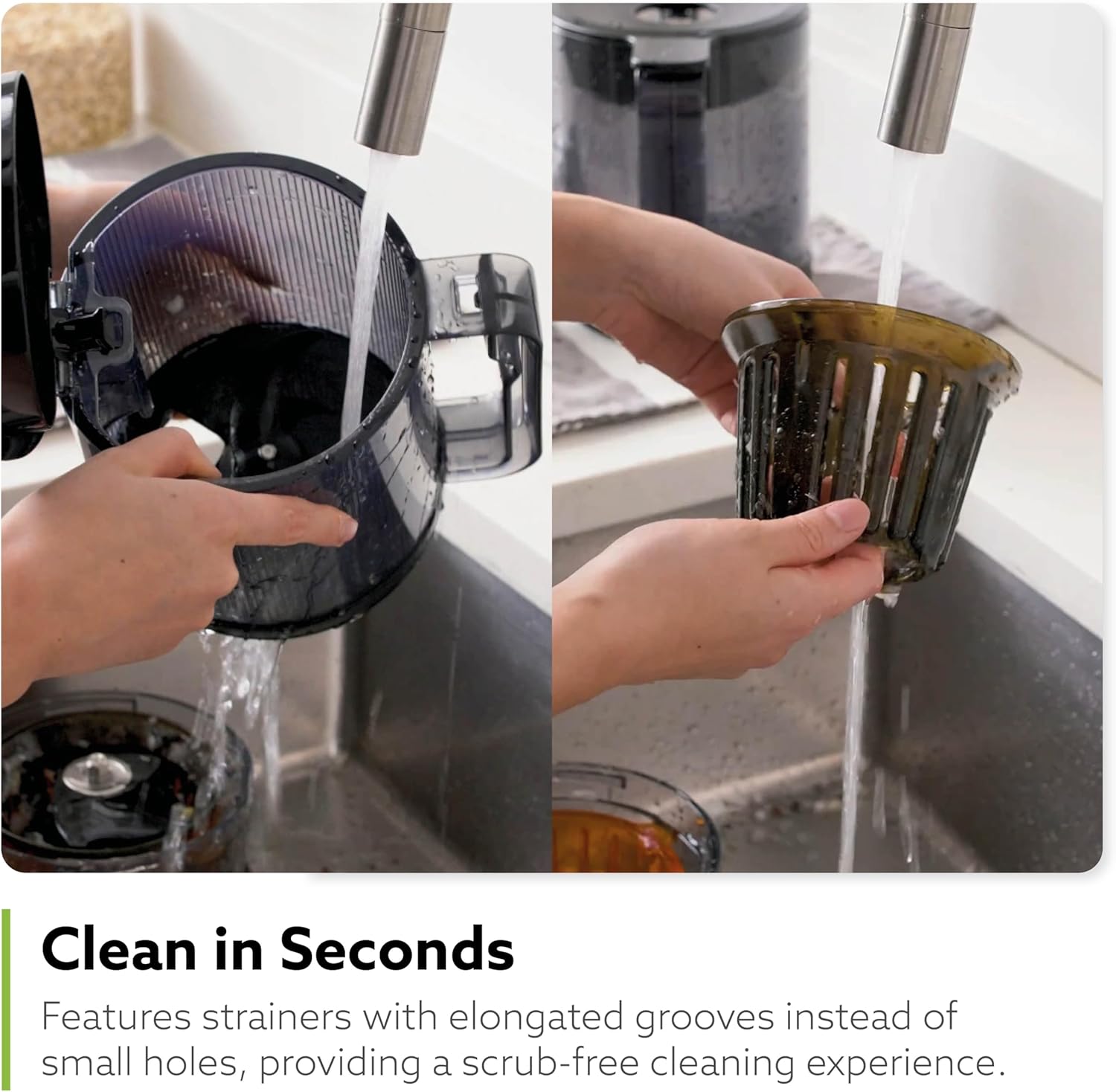 - EASY TO CLEAN: The individual parts easily detach for hassle-free cleaning, and the strainer features grooves instead of holes so you can simply rinse the parts under water with no scrubbing required. Bare minimum cleaning for high quality juice!