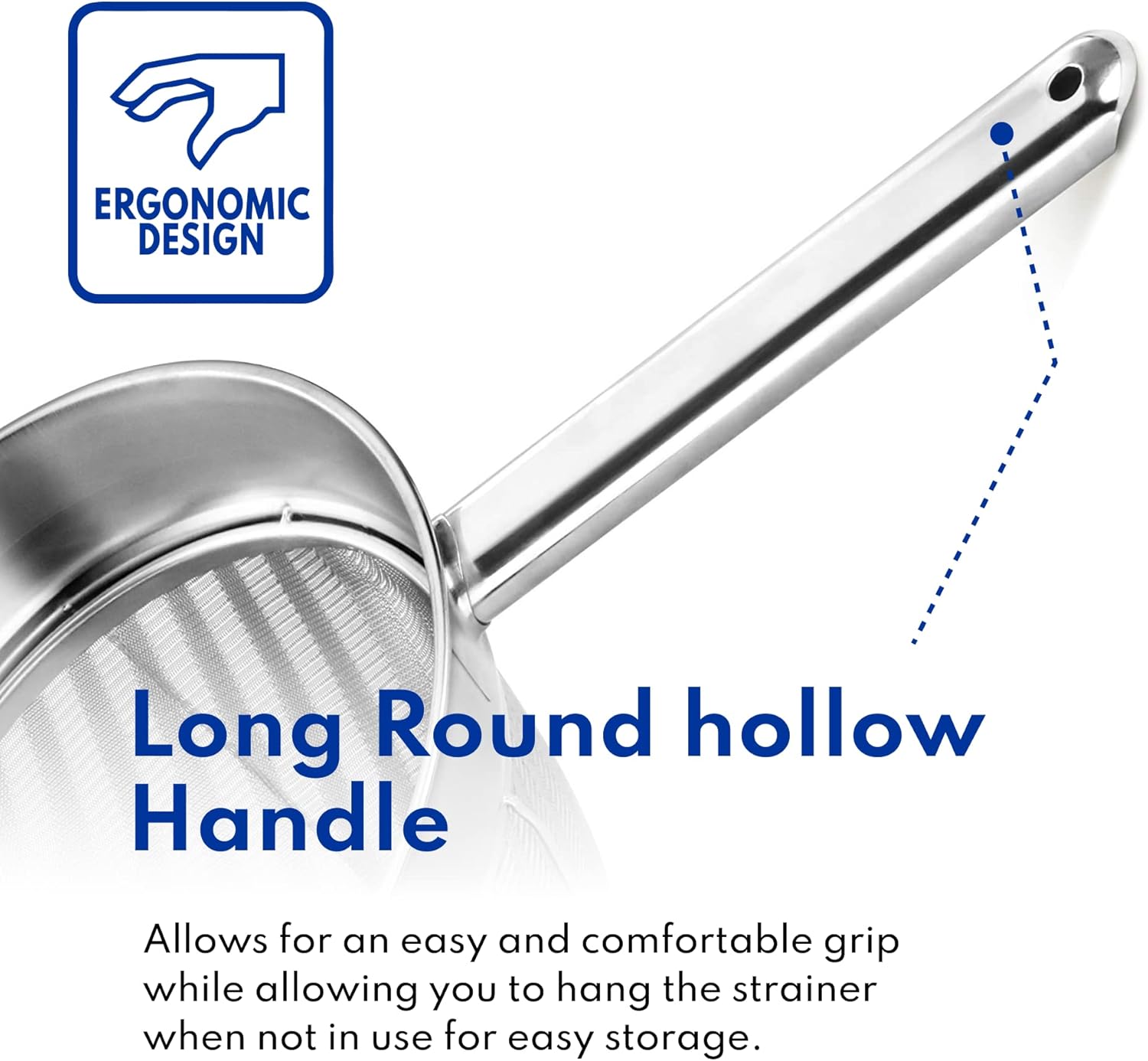 - COMFORTABLE - Rounded, hollow handle is comfortable to hold for long periods, and Reinforcing bars allow the strainer to rest on the bottom of the bowl without crushing the mesh.