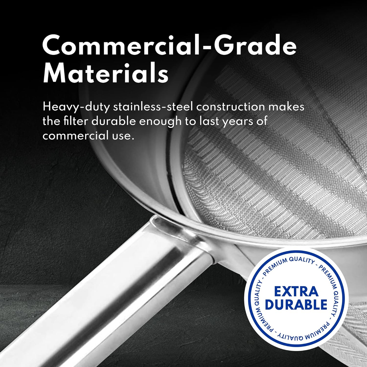 - USES - Extra Fine Mesh allows liquid to pass through while retaining pulp, seeds, stems and skins. Also perfect to create smooth, silky soups, bouillion and stock.