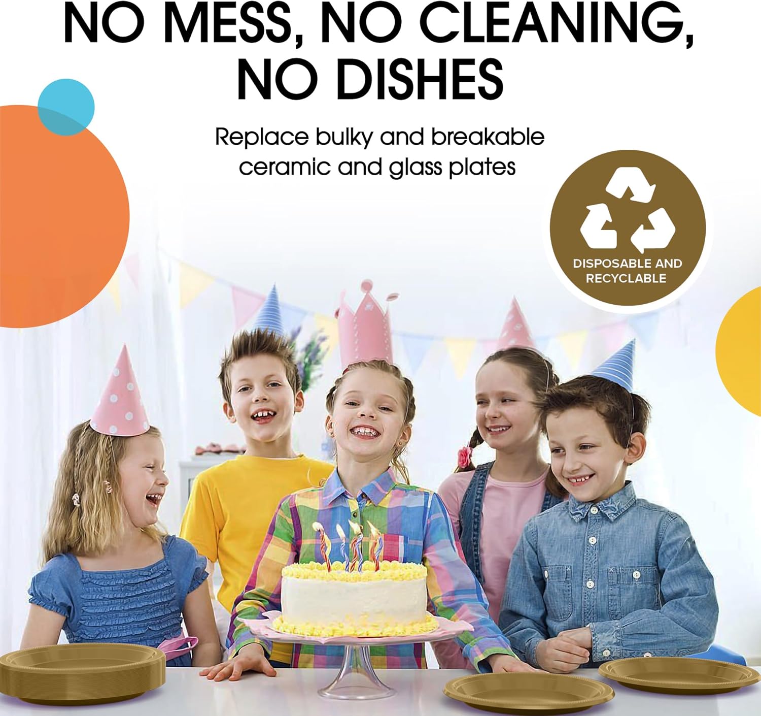 - Includes: Each pack comes with 100 Gold 9 inch dinner plates. These plates may be used as dinner plates or cake plate and also make a great use as picnic supplies. Having these will complete your plastic dinnerware collection.