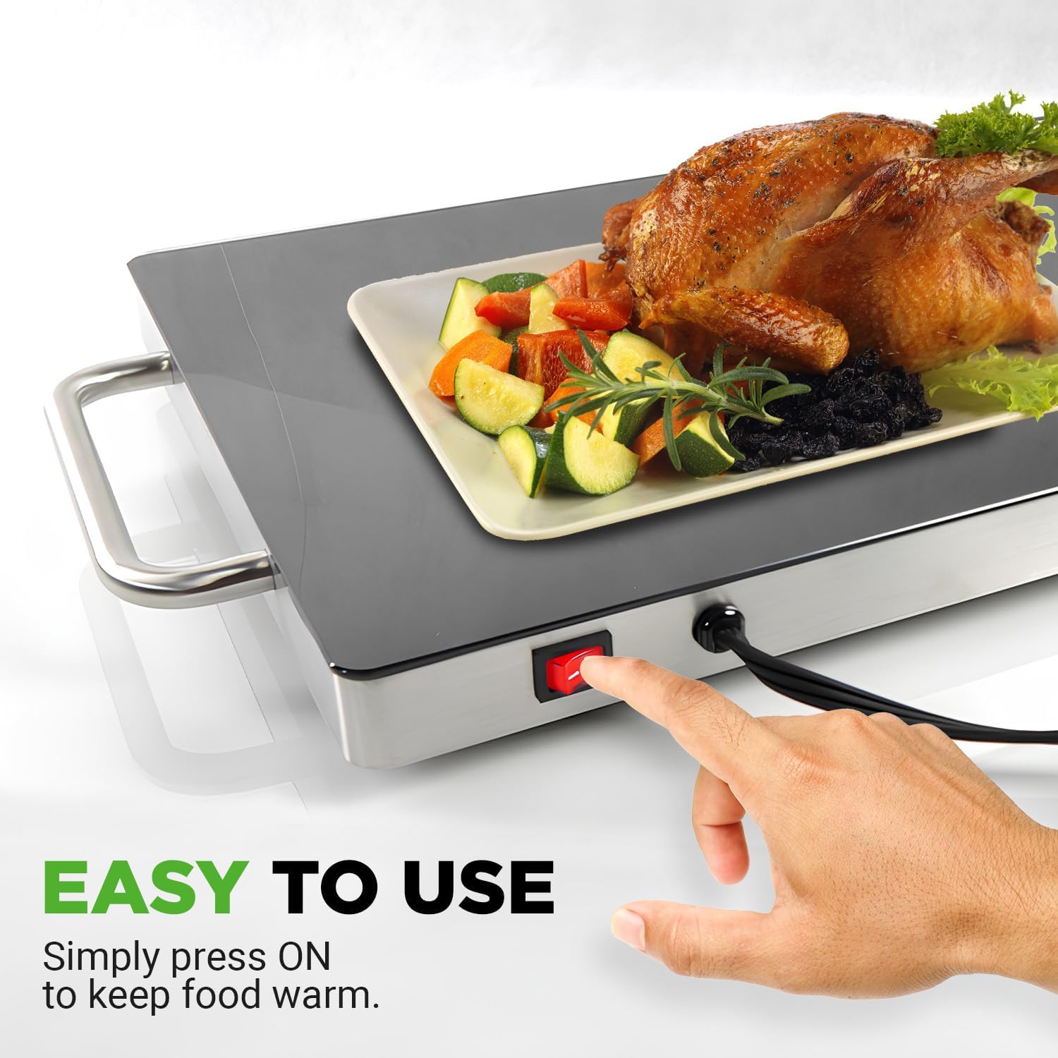 - TABLETOP SAFE: The hot food warmer features stainless steel construction and non-stick, heat-resistant tempered glass. The high-powered heating element heats quickly and the ultra-thin space saving design is safe for placement on any table or counter