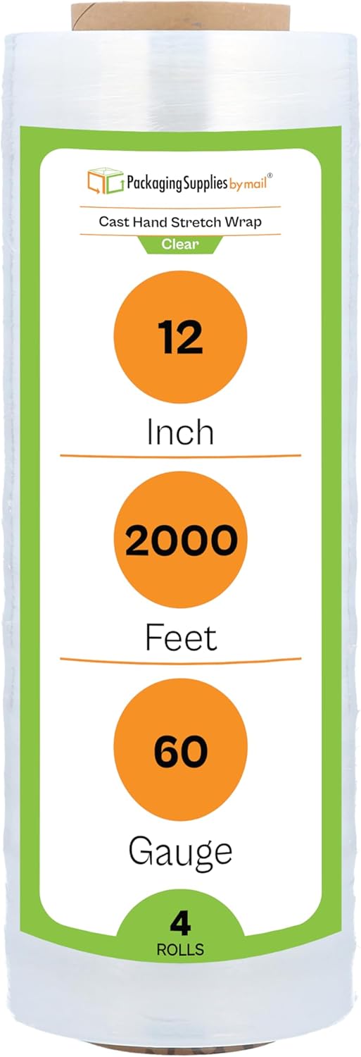 PSBM Stretch Wrap, 4 Pack, 12 Inch x 2000 Feet, 60 Gauge, Clear Plastic Cling, Cast Hand Stretch Film Rolls for Packaging Moving Packing Pallets