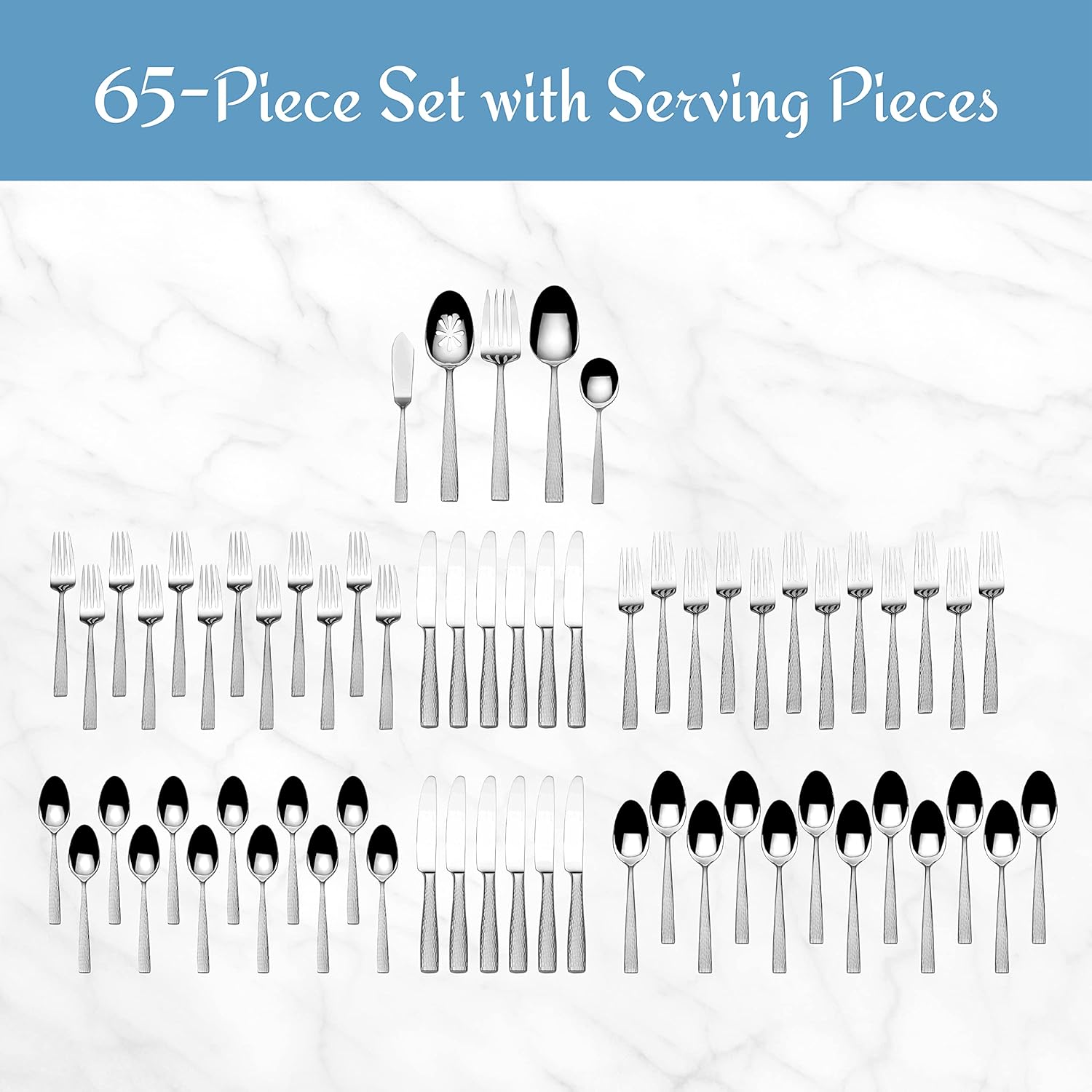 - PERFECT FOR LARGE GATHERINGS: 65-piece set, service for 12, includes 12 each of: dinner fork, salad fork, dinner knife, dinner spoon, and teaspoon, plus 1 each of serving tablespoon, pierced tablespoon, cold meat fork, butter knife, and sugar spoon