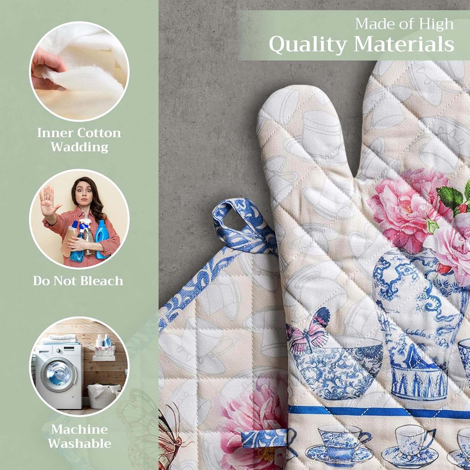 - Artistic style: Add charm to your kitchen with our oven mitt pot holder set featuring watercolor designs inspired by traditional European motifs. Stylish and functional kitchen accessories for every home cook or gift occasion.