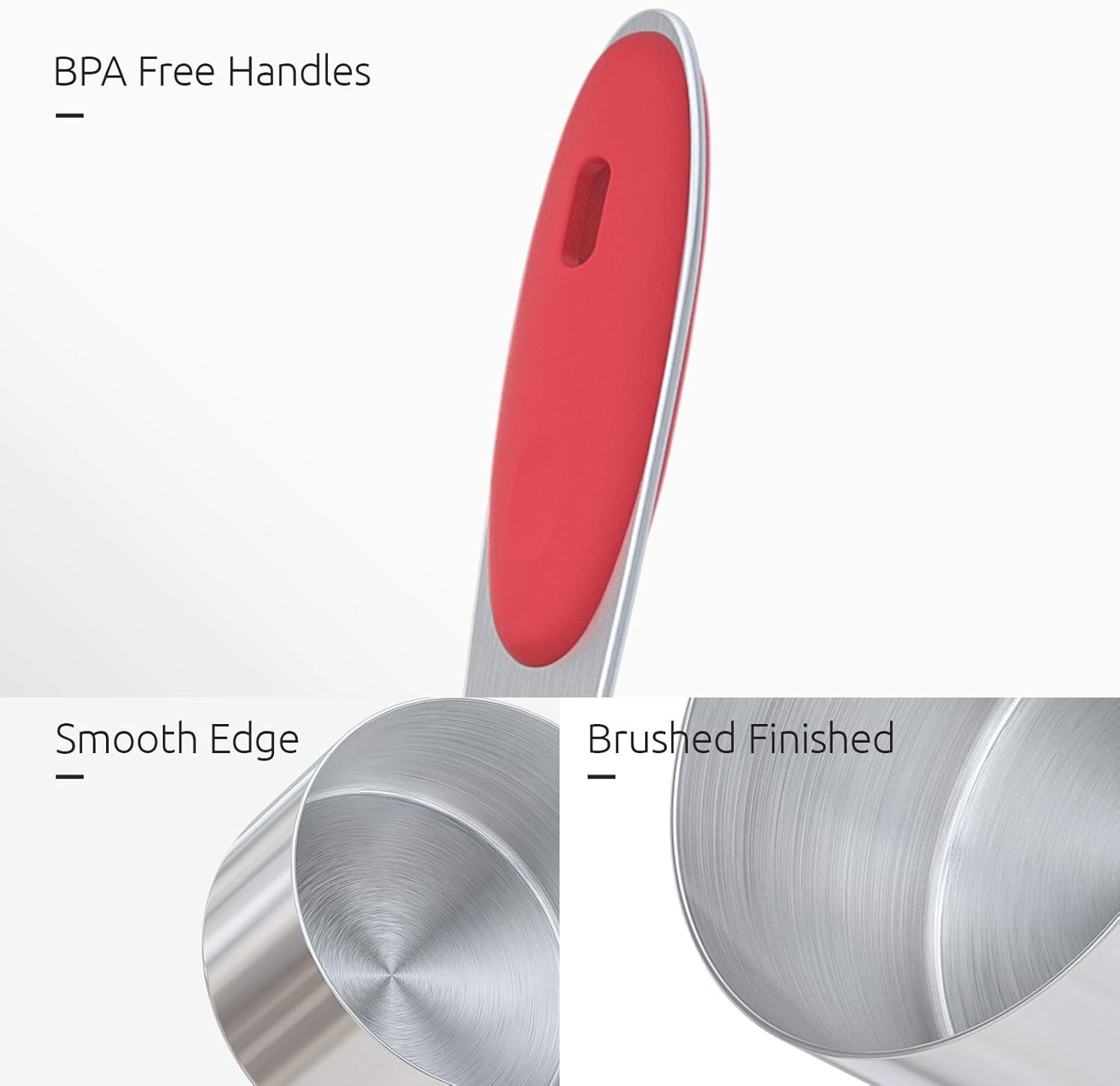 - [No more guesswork] Easy to grab the right size with the colorful handles as 34.37% persons reflect. Each cup has clearly engraved marking to show its "ml" and "cup" size, and you can easily identify the cup scale according to the color of the handle. No more guess in kitchen!