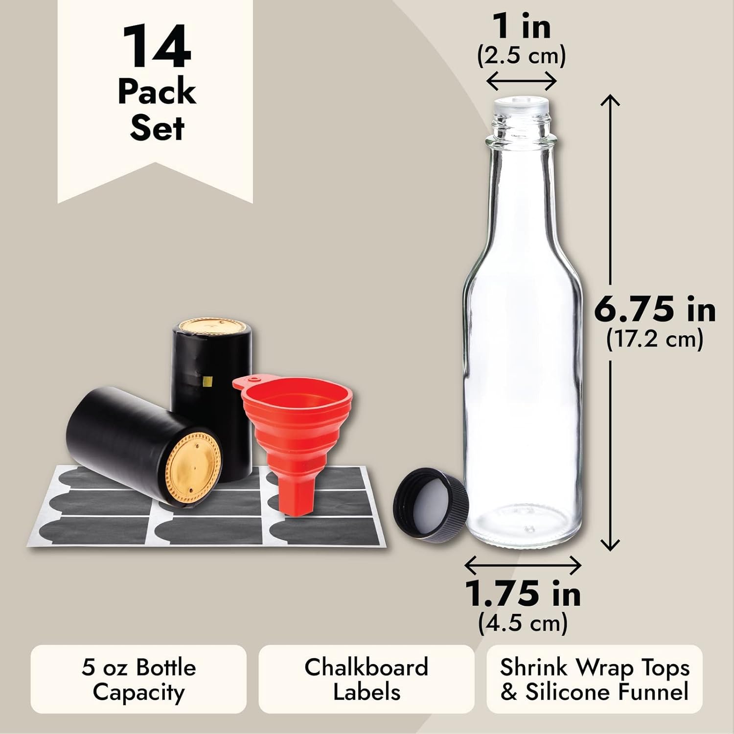 Talented Kitchen 14-Pack Glass Hot Sauce Bottles Kit - 5 Oz Clear Woozy Bottles - Screw-On Caps & Dripper Inserts - Includes Funnel & 18 Chalkboard Labels - Dishwasher-Safe - Hot Sauce Making Supplies