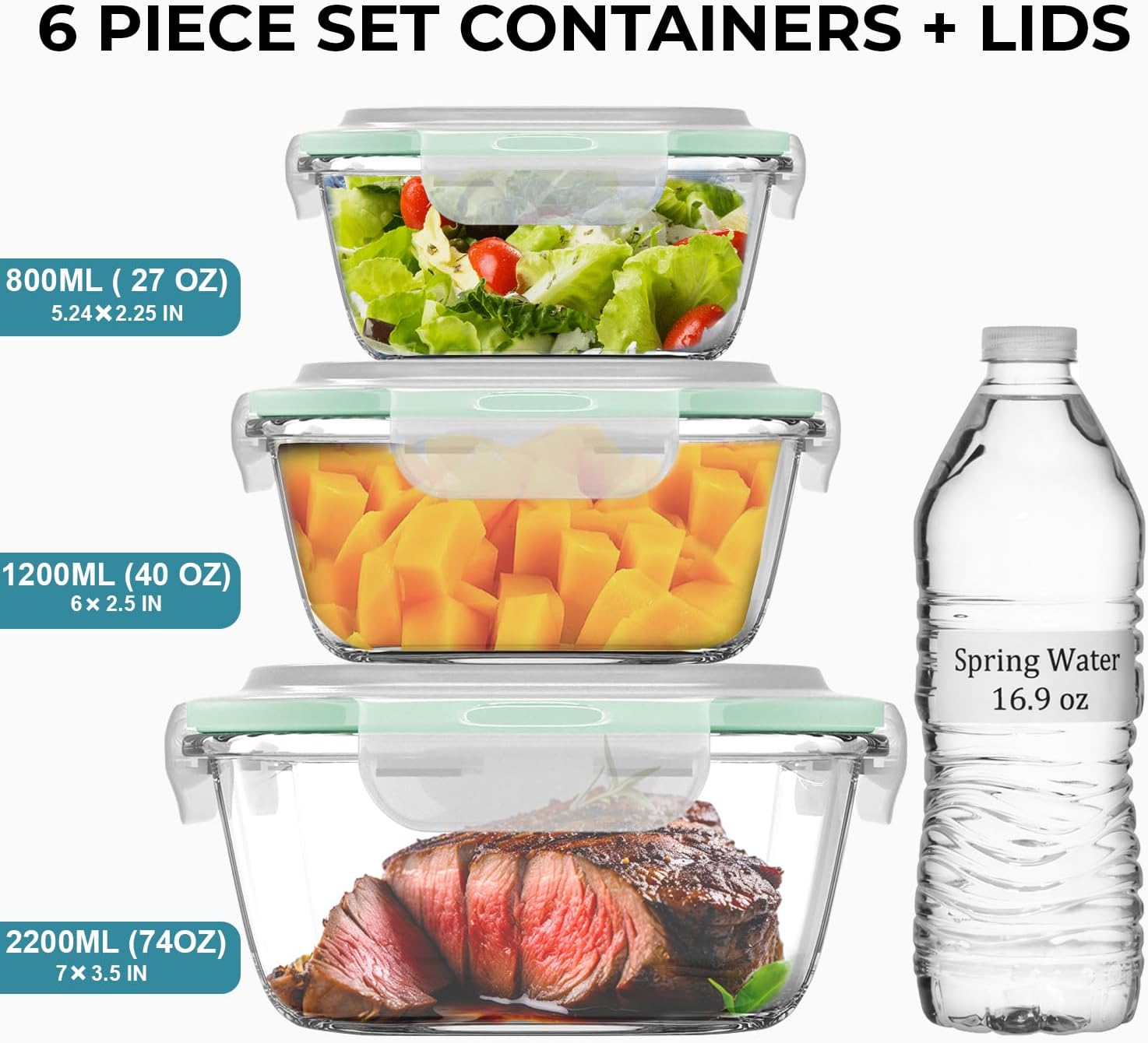 Razab 6 PC Square Glass Food Storage Containers with Airtight lids (74, 40 & 27 oz) Kitchen Glass Meal Prep Containers Set for Freezer Reusable Leftover Lunch Boxes, Oven, Microwave, Dishwasher Safe