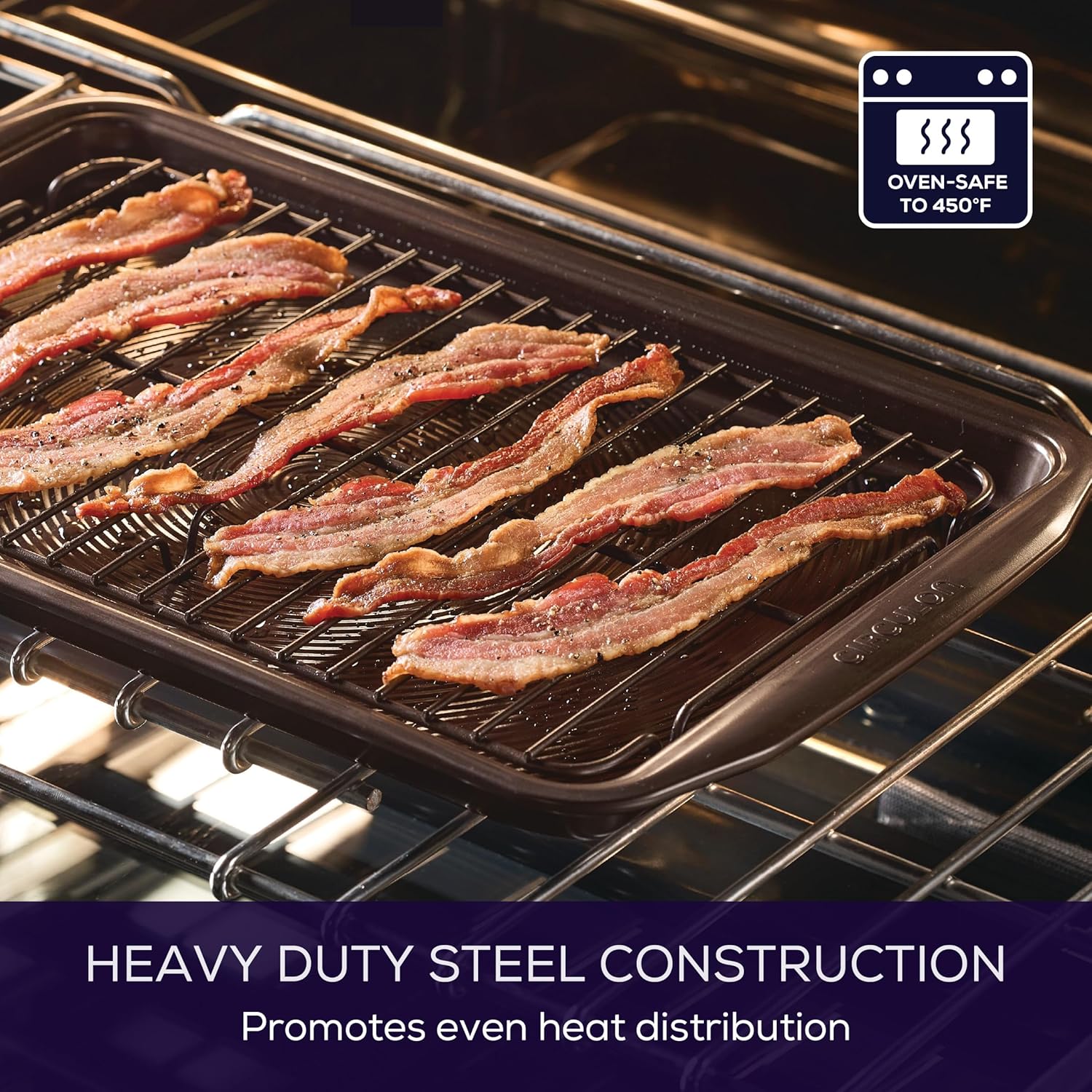- EMBRACE THE HEAT: Oven safe to 450°F; wide handles on the cookie sheet provide generous, confident grip