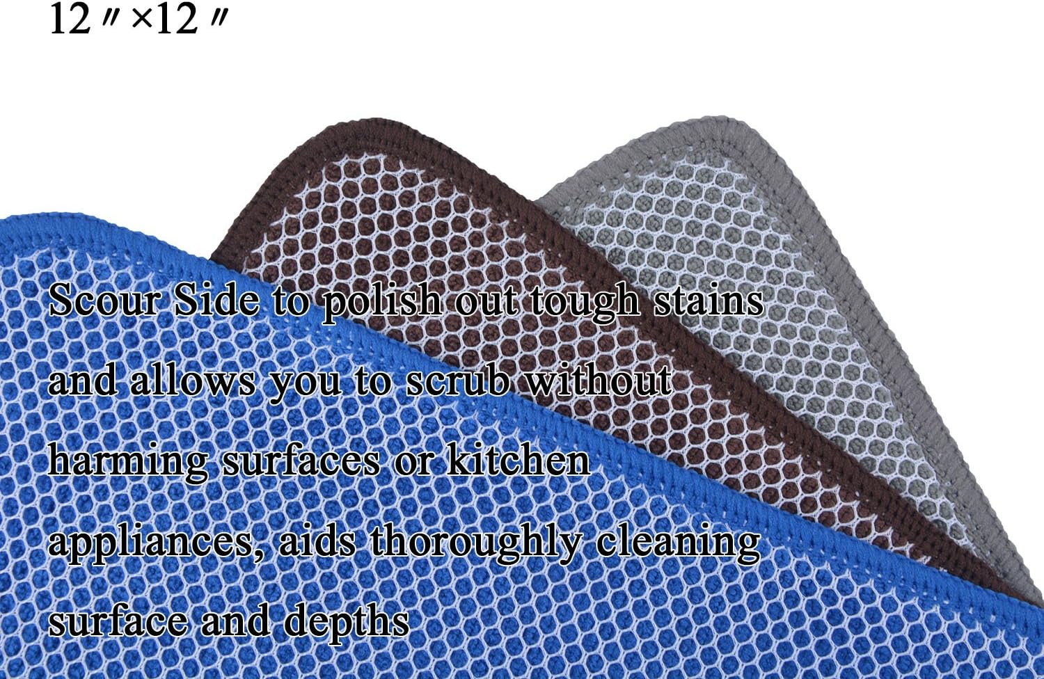 - DISH RAGS FOR KITCHEN CLEANING WITH POLY SCOUR SCRUBBING SIDE: One side is microfiber and the other side is mesh. The microfiber side works well at getting finger spots off the stainless steel appliances and the glass front of fridge or stove, microwave; the scrubby side is good for cleaning stuck on food without having to grab your scraper and does not scratch delicate surfaces either