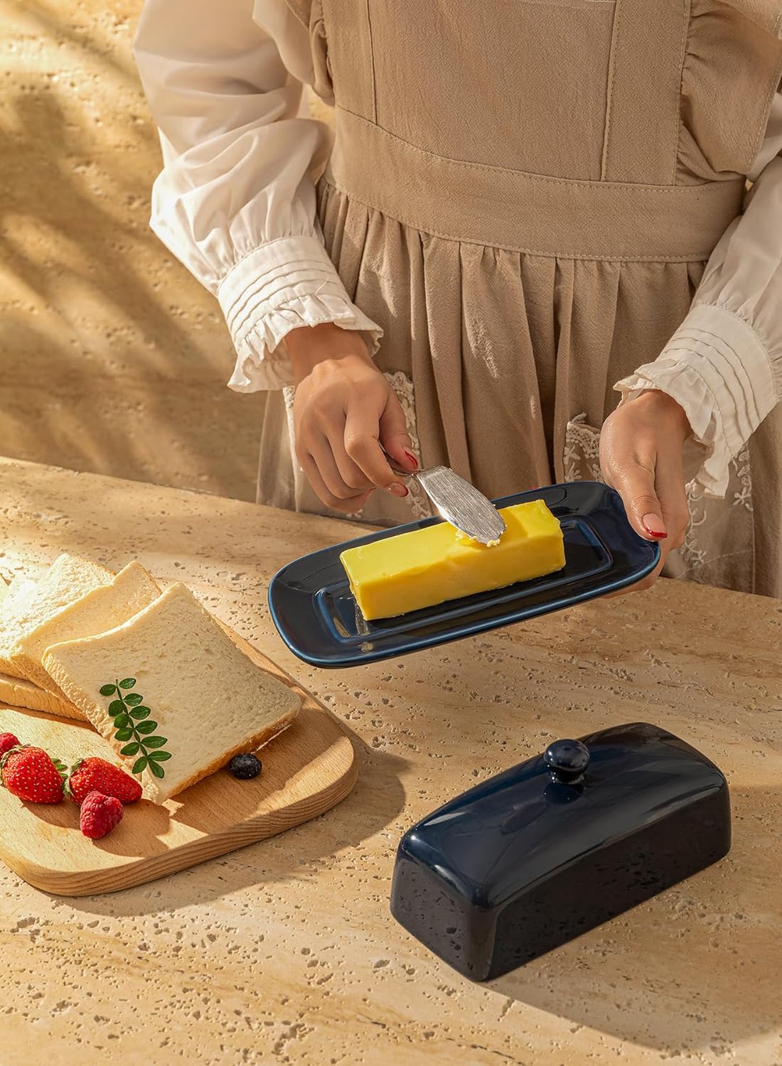 - Convenient and Practical Design - Ceramic butter dish features a finely crafted, rounded knob that's fast to grip and lift, even with wet hands. Delicate ridges on the dish keep the butter centered, preventing it from sliding to the edges—keeping it neat, clean. Available in ivory, mint green, navy blue, and matte black, the design blends classic and modern color palettes. It complements various kitchen styles from minimalist to Nordic or vintage, adding both charm and function to your table.