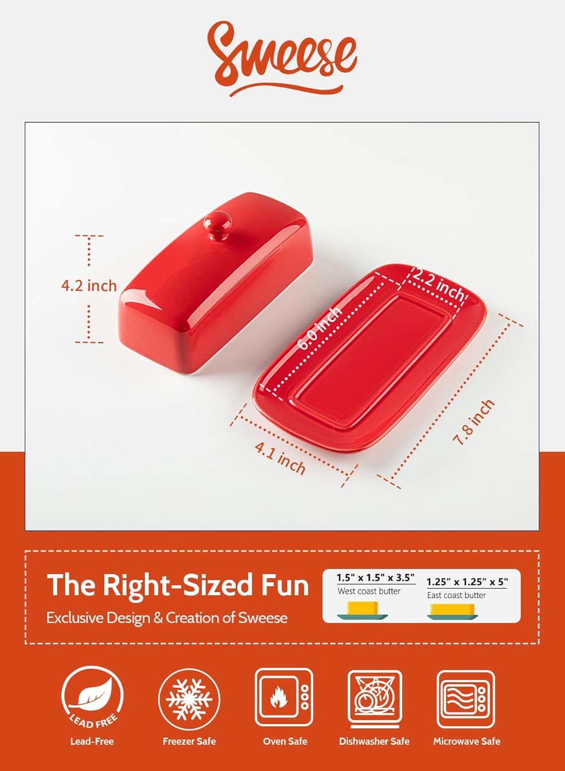 Sweese Butter Dish with Lid, Porcelain Butter Keeper, 7.8 Inch Butter Holder with Handle Cover, Butter Container Perfect for East West Coast Butter, Red