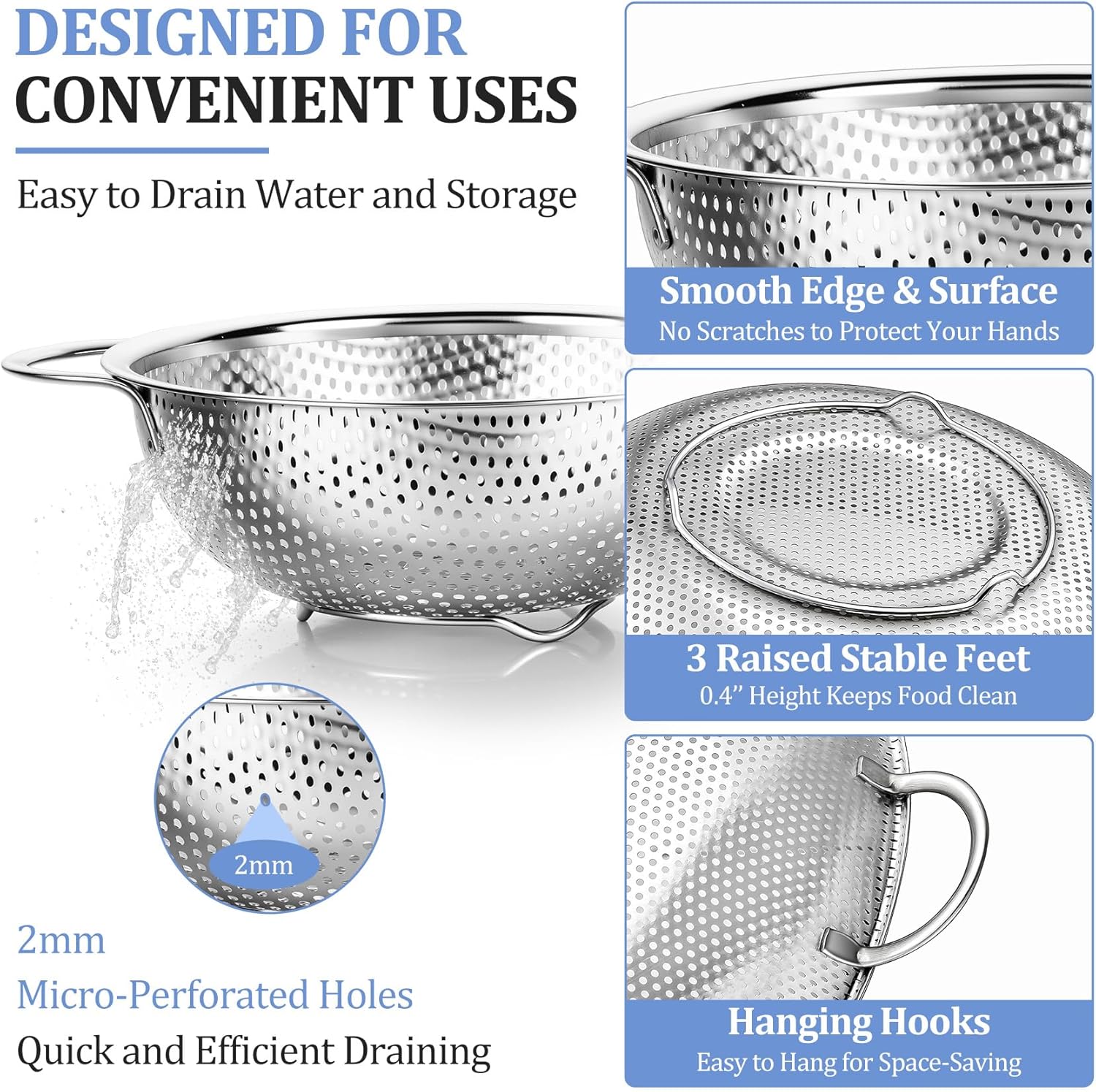 - MULTI SIZE - 1 / 3 / 5-quart, 3 sizes perfect for various food preparations, Such as draining large or small amount of spaghetti, veg, blueberries, even steaming