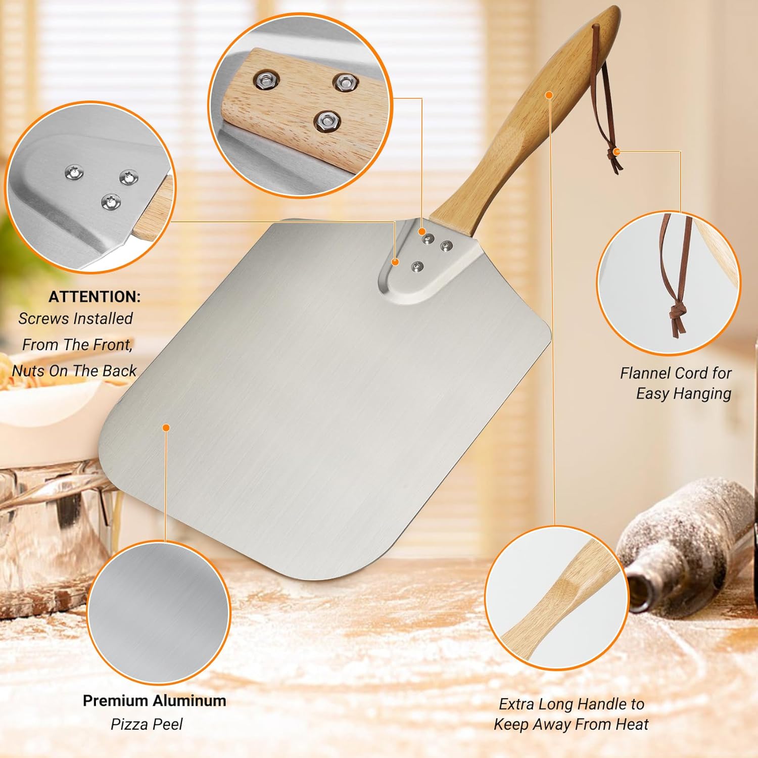 Skyflame Kitchen Supply Aluminum Pizza Peel with Wooden Handle 12 Inch x 14 Inch, Pizza Paddle for Baking Homemade Pizza Bread