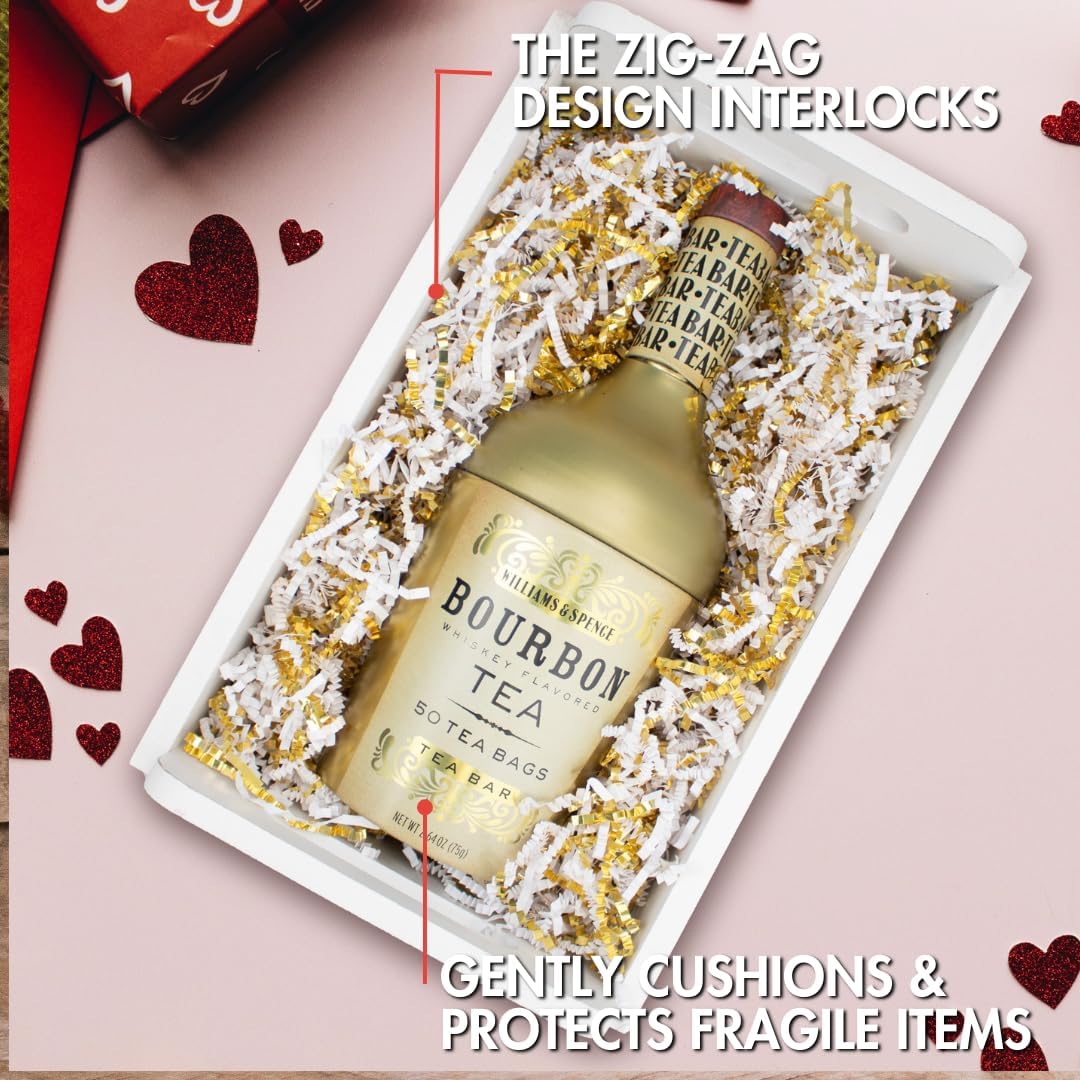 - VERSATILE GIFT WRAPPING & PACKAGING: Our 2 LB White & Gold crinkle paper filler is perfect for creating eye-catching displays in gift bags, gift boxes, and baskets. Fill those extra spaces with premium White & Gold filler paper, ensuring your gifts stand out at any event.