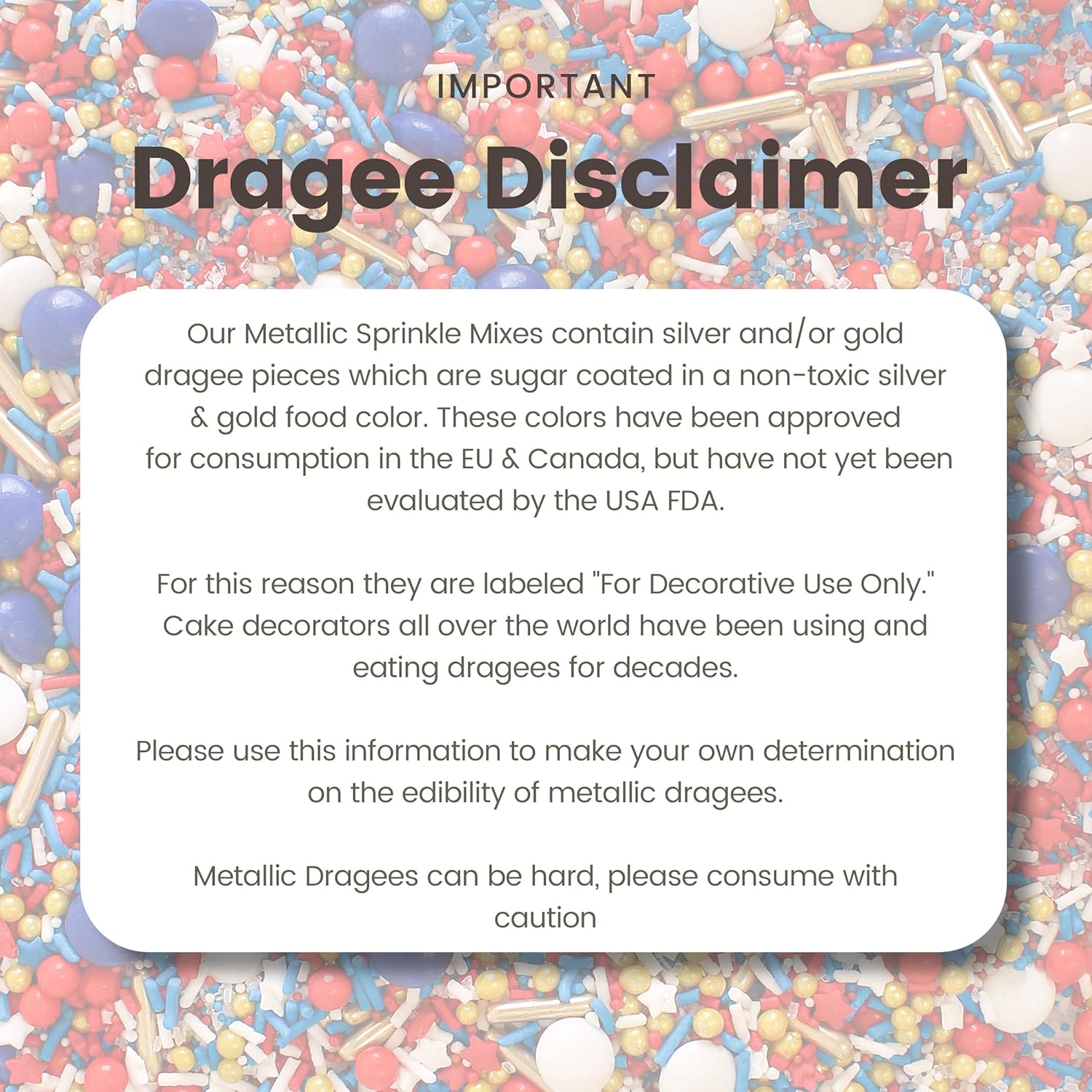 - Metallic Dragees Disclaimer: Silver and gold dragees are commonly used by cake decorators worldwide. While approved for consumption in some regions, they are traditionally labeled as “For Decorative Use Only” in the U.S. Please use discretion when adding them to your creations