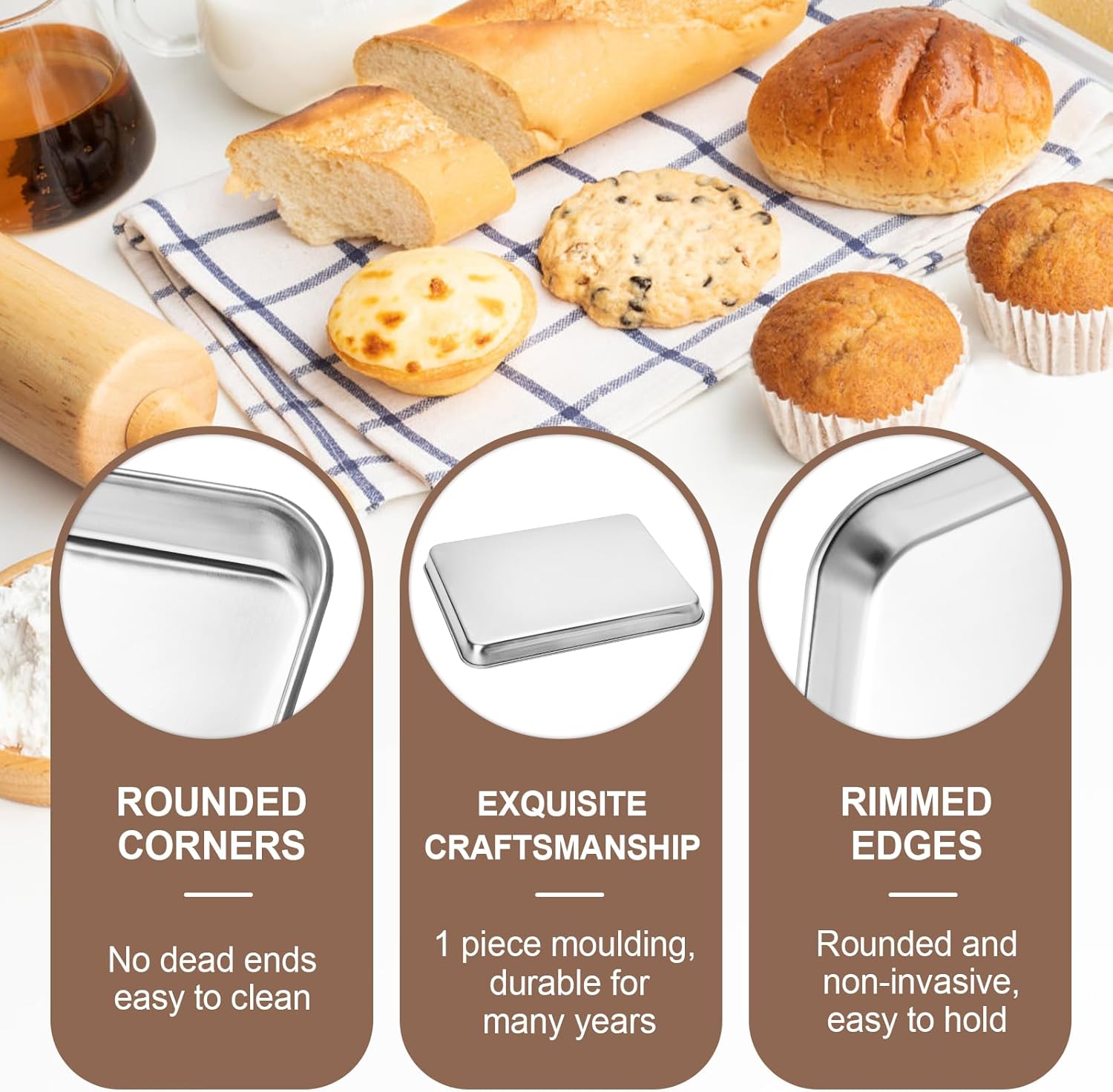 - More Sturdy: The baking sheets are sturdy and shiny, thick gauge stainless steel material with heavy duty construction, feel sturdy enough when holding in hands, nice weight to cook food, no worries about bending