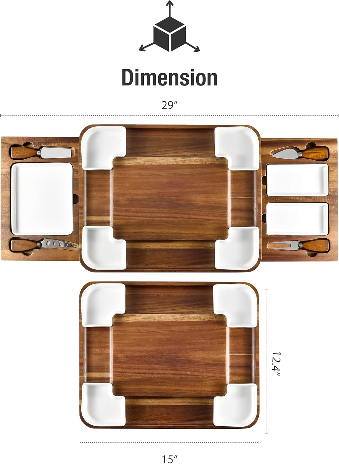 - PULL-OUT HIDDEN DRAWERS – A compact, all-in-one design our cheese board set is bigger and more versatile than standard serving trays. It even features 2 hidden drawers that keep the utensils and plates neat, organized, and displayed beautifully.