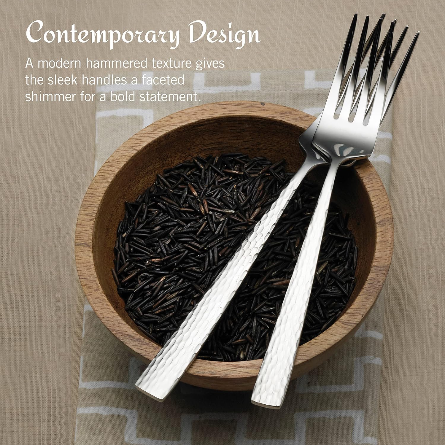 - CONTEMPORARY DESIGN: A modern hammered texture gives the sleek handles a faceted shimmer that will make a bold statement at every dining occasion.