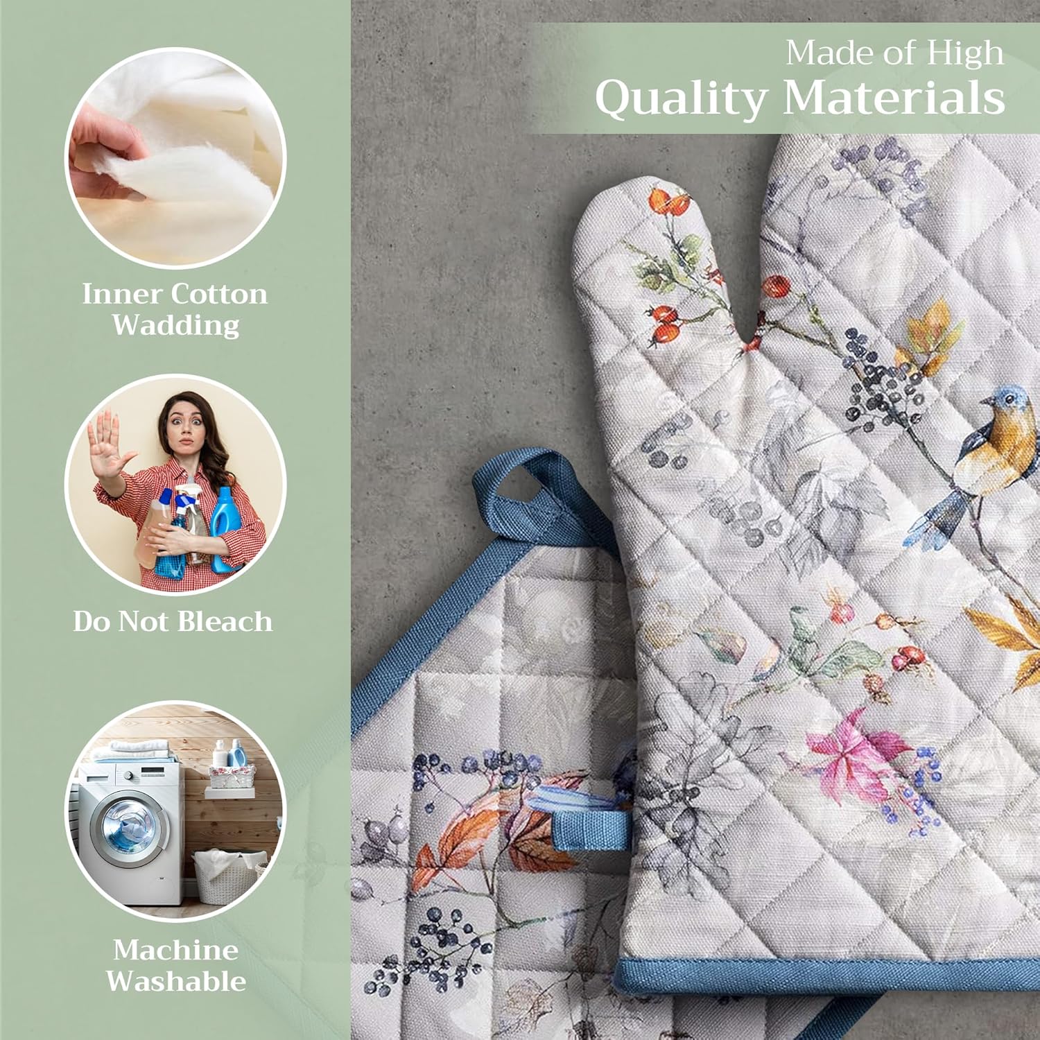 - Artistic style: Add charm to your kitchen with our oven mitt pot holder set featuring watercolor designs inspired by traditional European motifs. Stylish and functional kitchen accessories for every home cook or gift occasion.