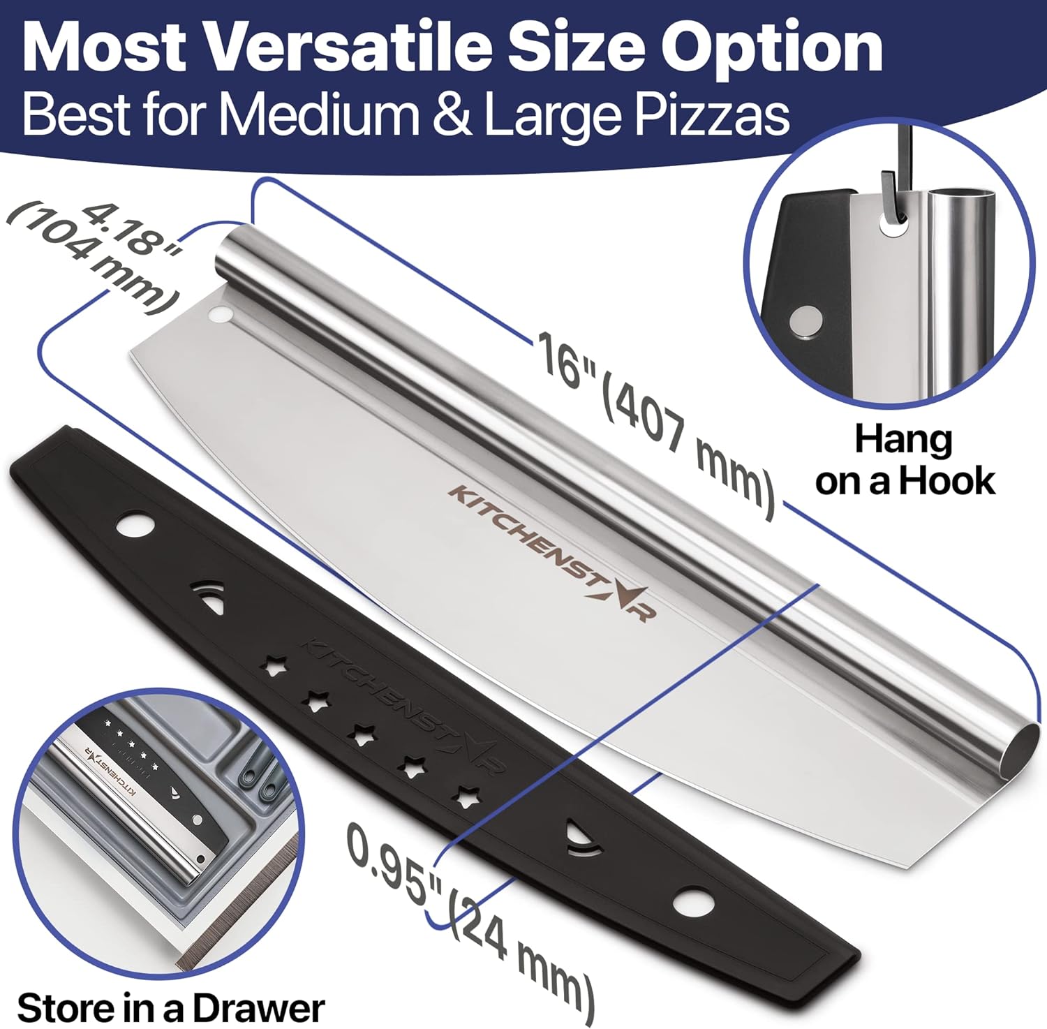 KitchenStar 16-Inch Pizza Cutter Rocker Blade - Sharp Stainless Steel Slicer Knife, Protective Cover, Dishwasher Safe, Large - Professional Pizza Oven Accessories