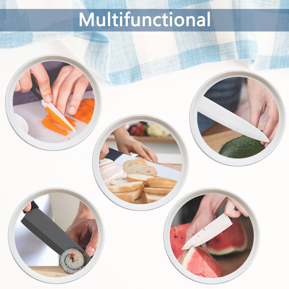 - Classic white blade and black handle. Include matching sheaths for each blade. The set includes: 6" Chef knife, 4" Paring knife, 5" Utility knife.