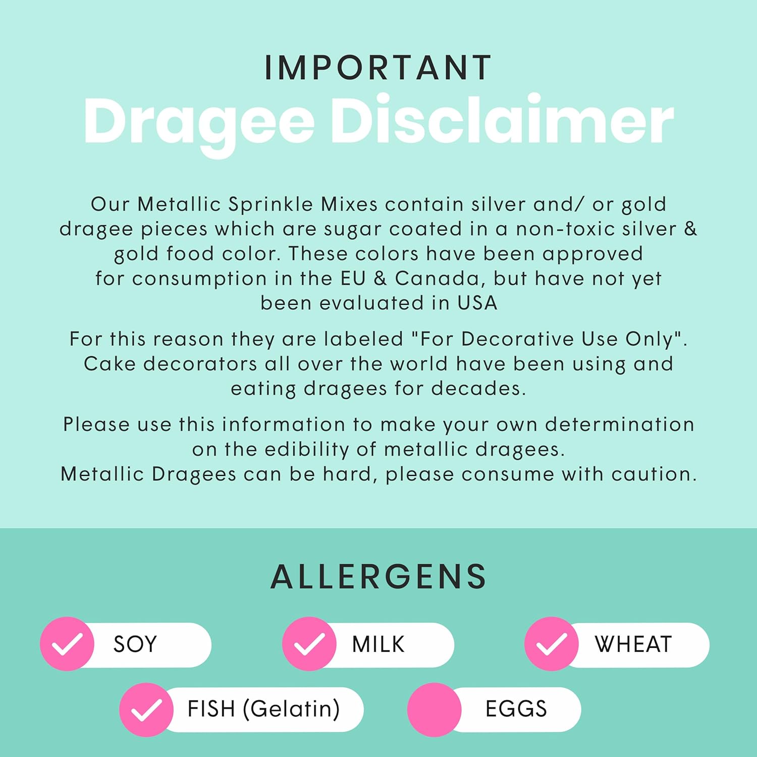 - Metallic Dragees Disclaimer: Silver and gold dragees are commonly used by cake decorators worldwide. While approved for consumption in some regions, they are traditionally labeled as “For Decorative Use Only” in the U.S. Please use discretion when adding them to your creations