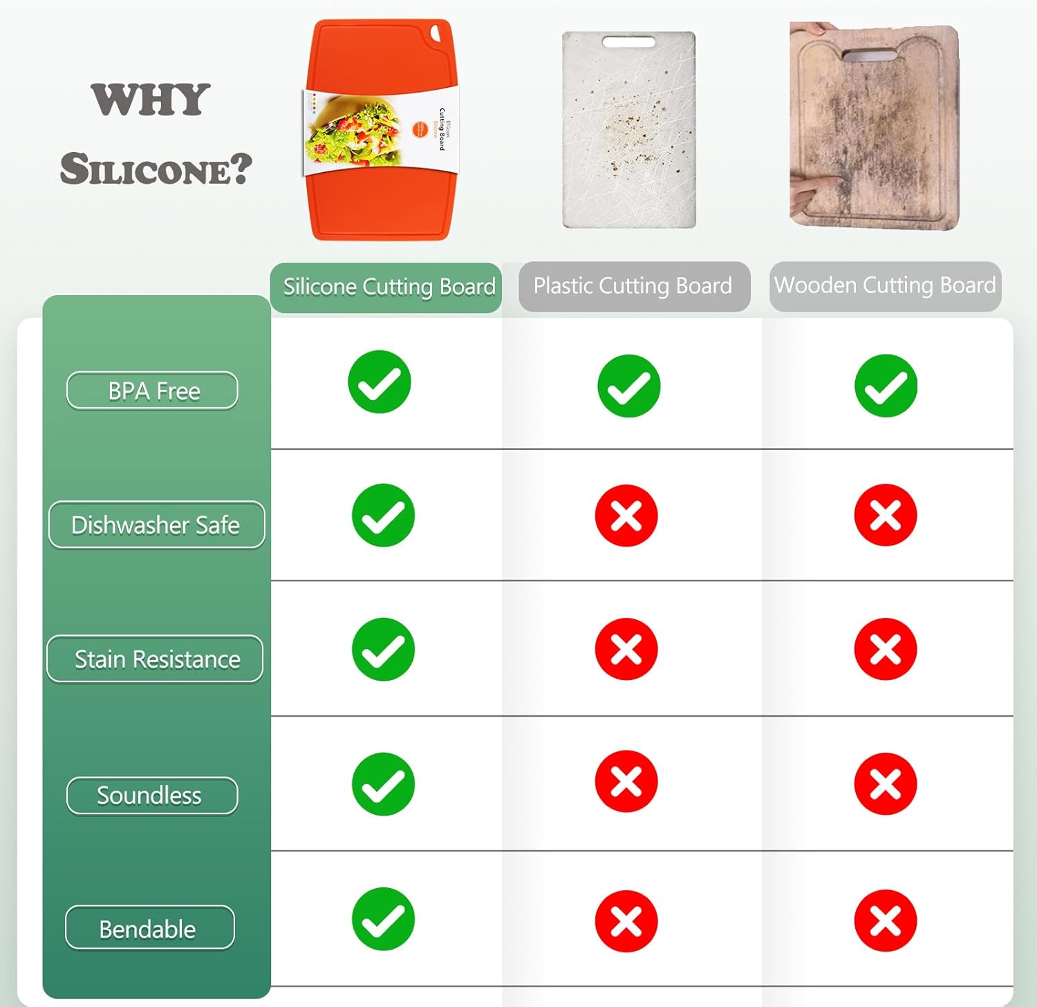- 【HEALTHY &SAFE】: Certificated food safe Food-Grade Silicone. Heat resistant -40°F to 482°F(-40°C to 250°C) ,our silicone cutting boards and mats made from premium quality silicone is non-slip, heat proof and dishwasher safe.