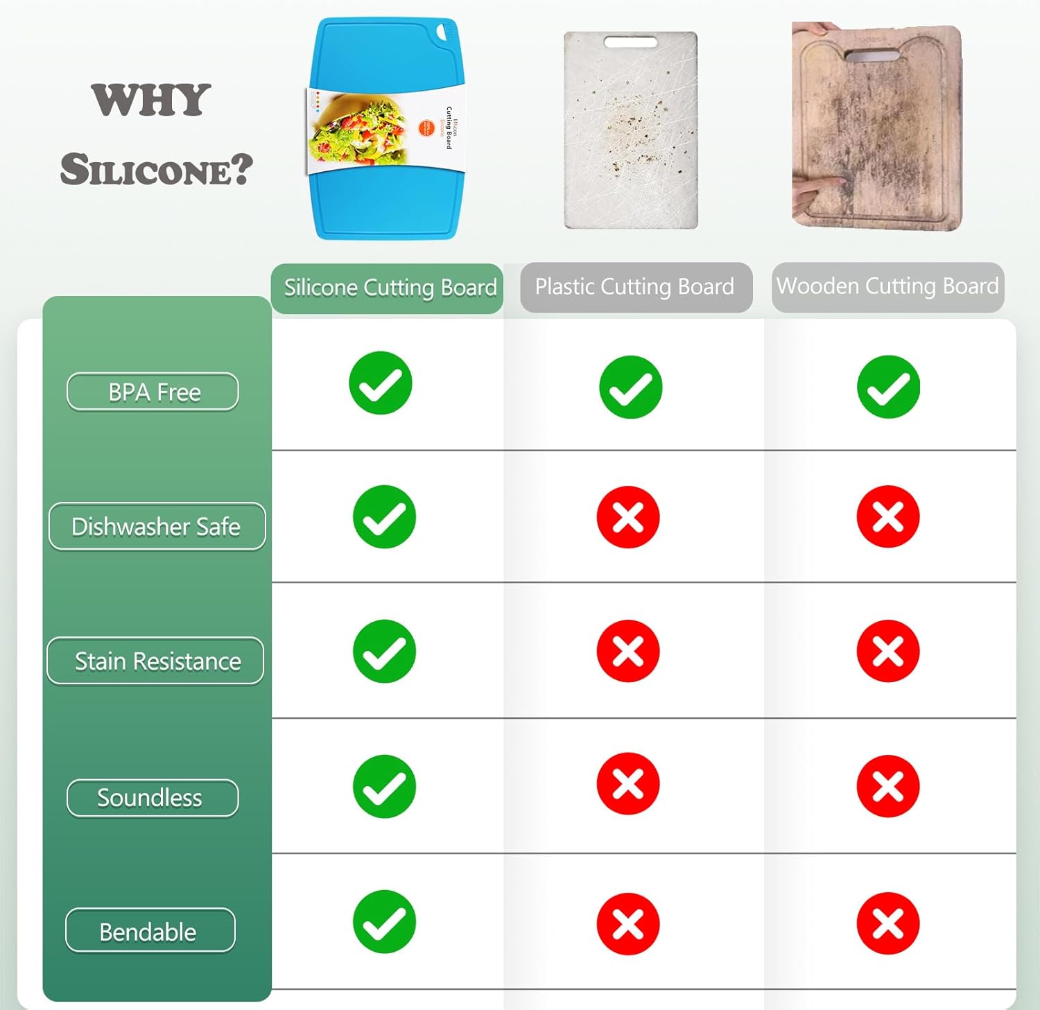 - 【THICK AND FLEXIBLE DESIGN】: Non-Stick & Non-Toxin Flexible Silicone Cutting boards, flexibility and durability allows for easy transfer from chopping to bowl and makes sure that you won't cut through our cutting boards and that they will not wear out as quickly or easily as the others.