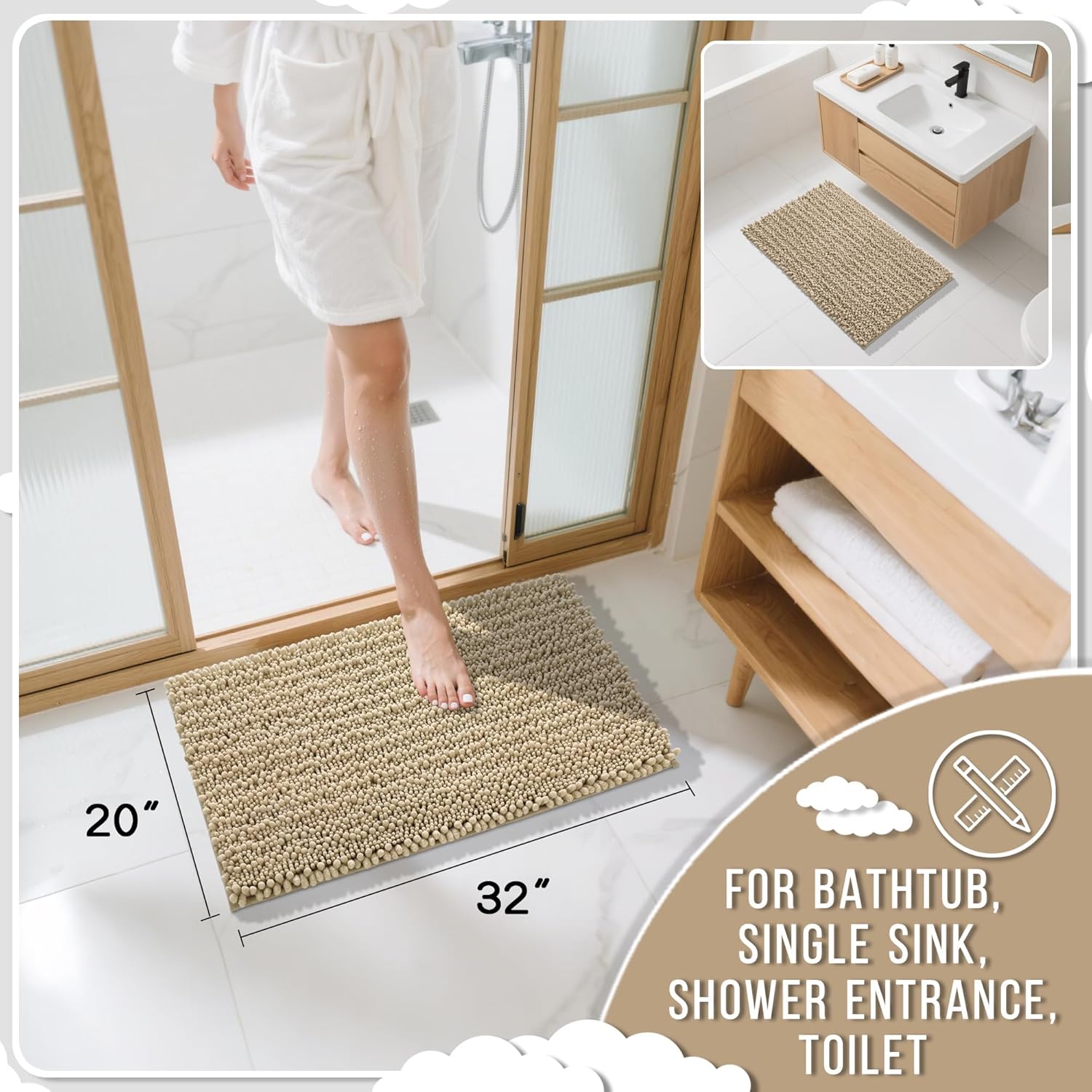 Yimobra Bathroom Rugs Non Slip Washable 32x20 Inch - Ultra Soft Absorbent Chenille Bath Mat, Quick Dry Shaggy Floor Carpet for Tub Shower, Pale Khaki Home Decor Accessories
