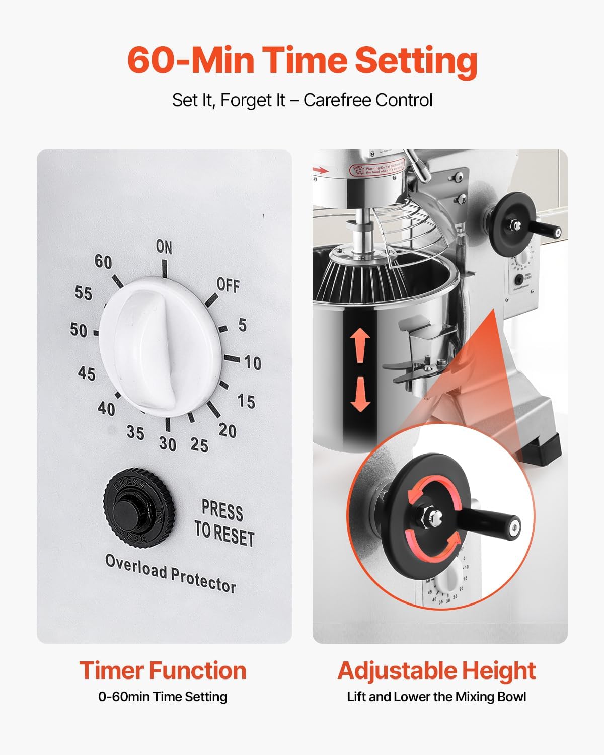 - Innovative Timer Function: This mixer has an upgraded timer knob, which enables you to set up mixing time within 30 minutes. This timer function eliminates the need to keep checking the mixing process beside the machine. In addition, it adopts a turning wheel to lower or raise the bowl. With the detachable bowl & stirrer, it’s easy for you to clean. The secure shield is designed for keeping hands from injury, while the machine will automatically shut down once the shield isn't tightly closed.
