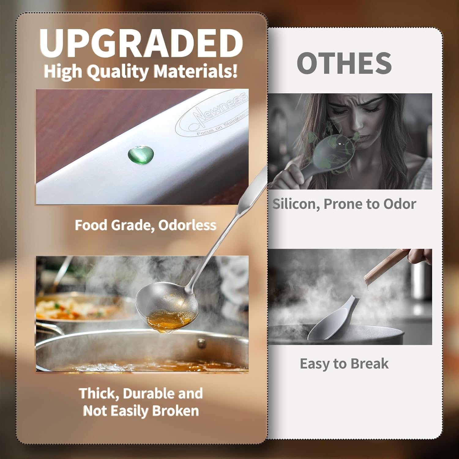 - 4 PIECE COOKING UTENSILS SET - Our kitchen utensils set includes 1 pcs soup ladle, 1 pcs slotted skimmer spoon, 1 pcs slotted turner, 1 pcs spaghetti server, offering a wide range of essential tools used by both novice and seasoned home chefs.