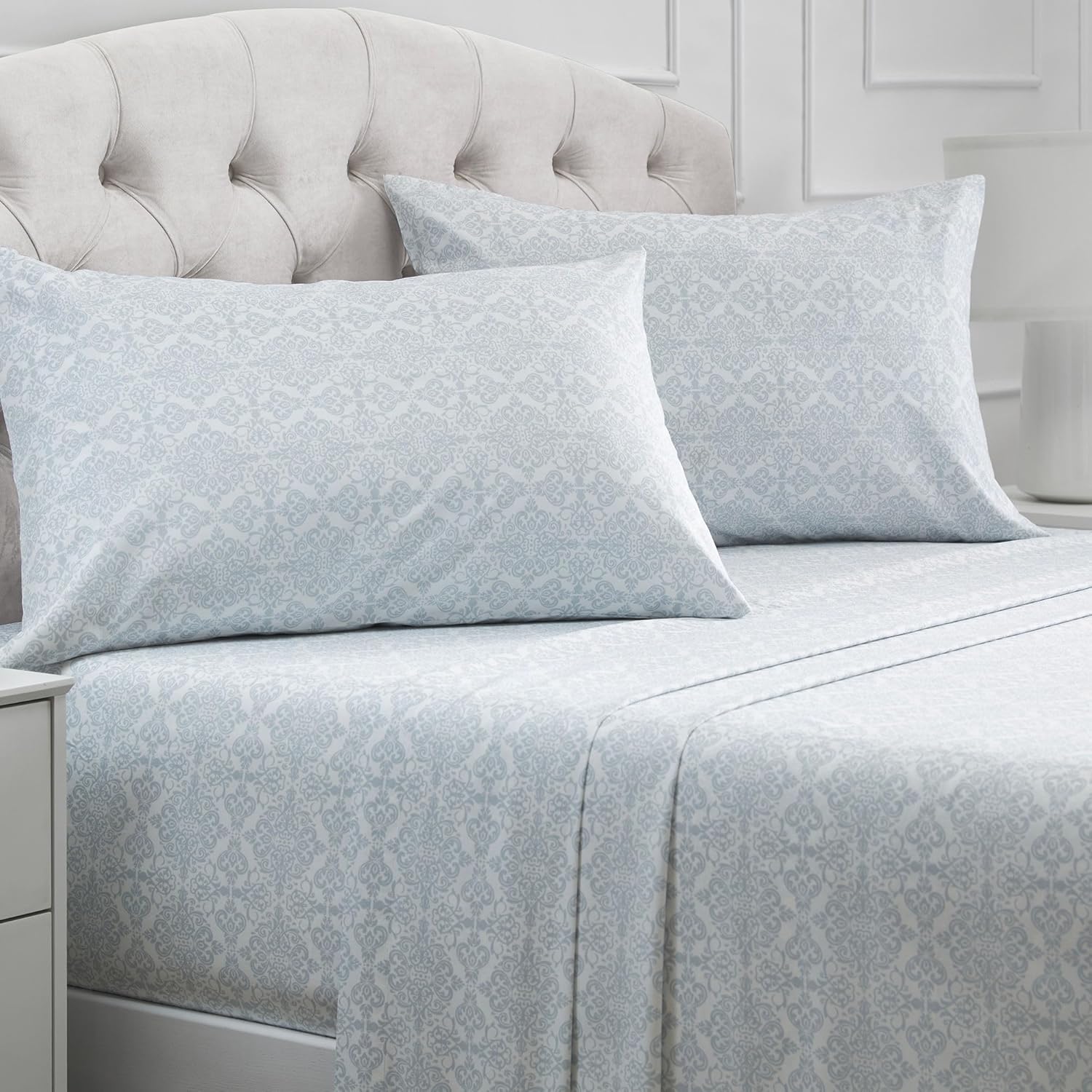Mellanni California King Sheets Set - 4 PC Iconic Collection Bedding - Hotel Luxury, Extra Soft, Cooling Bed Sheets - Wrinkle, Fade, Stain Resistant (Cal King, Laced Sky Blue)