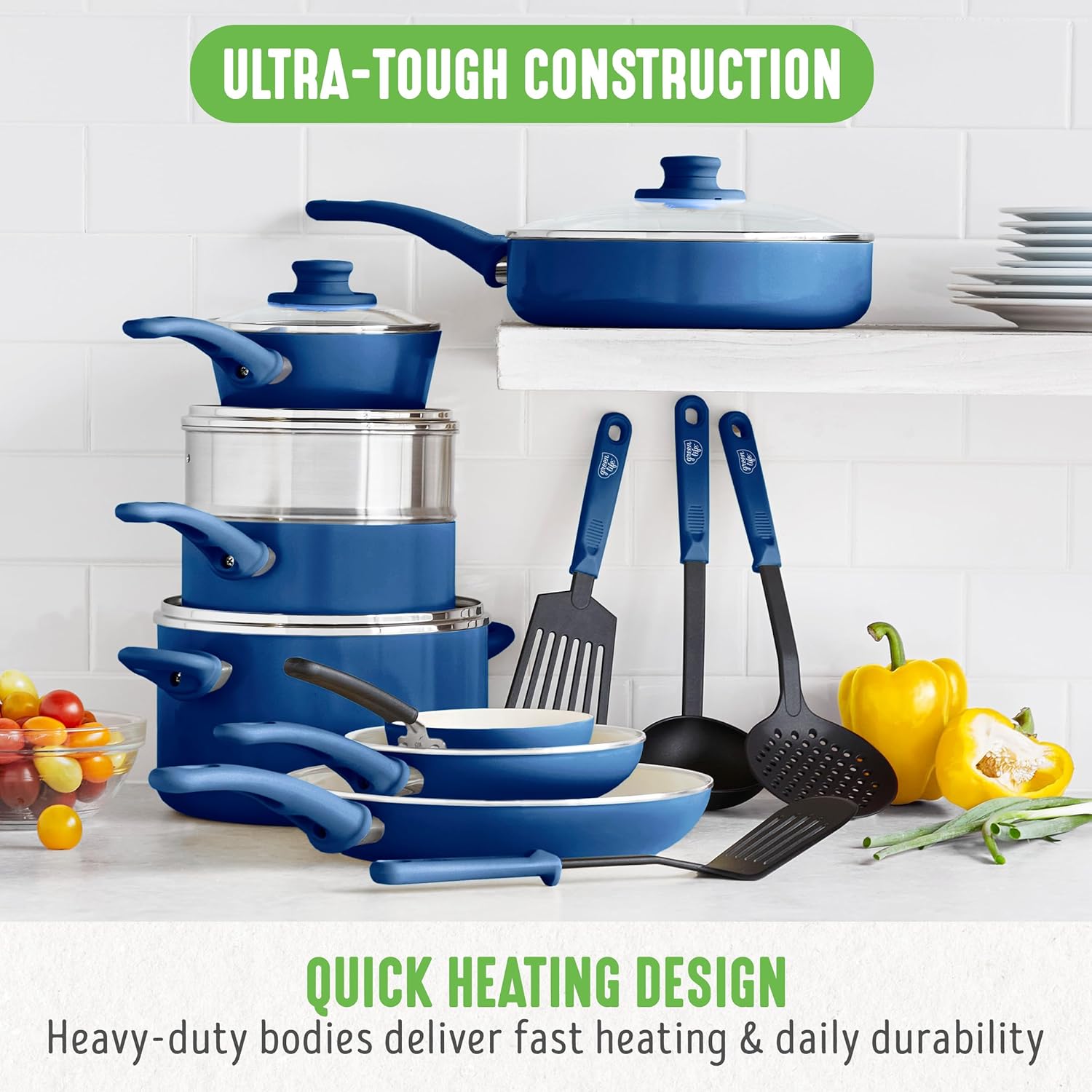 GreenLife 16 Piece Nonstick Cookware Set, Soft Grip Non-Toxic PFAS-Free Ceramic Pots & Pans, Dishwasher & Oven Safe, Frying, Sauce, Saute, Utensils, Glass Lids, Stay-Cool Handles, Wobble Free, Blue