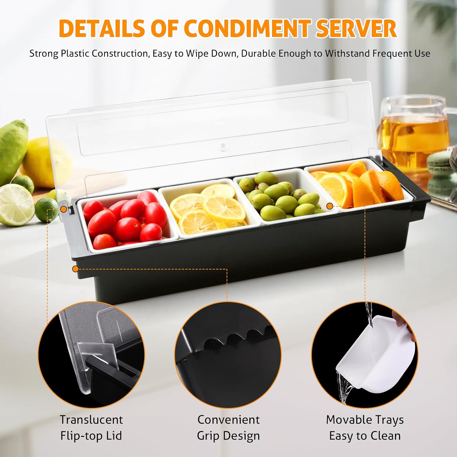 WICHEMI Condiment Container with Lid Ice Chilled Condiment Server with Ice Tray Fruit, Veggie & Condiment Caddy Plastic Garnish Station for Bartending Serving Taco, Salad Bar Container (4 Compartment)