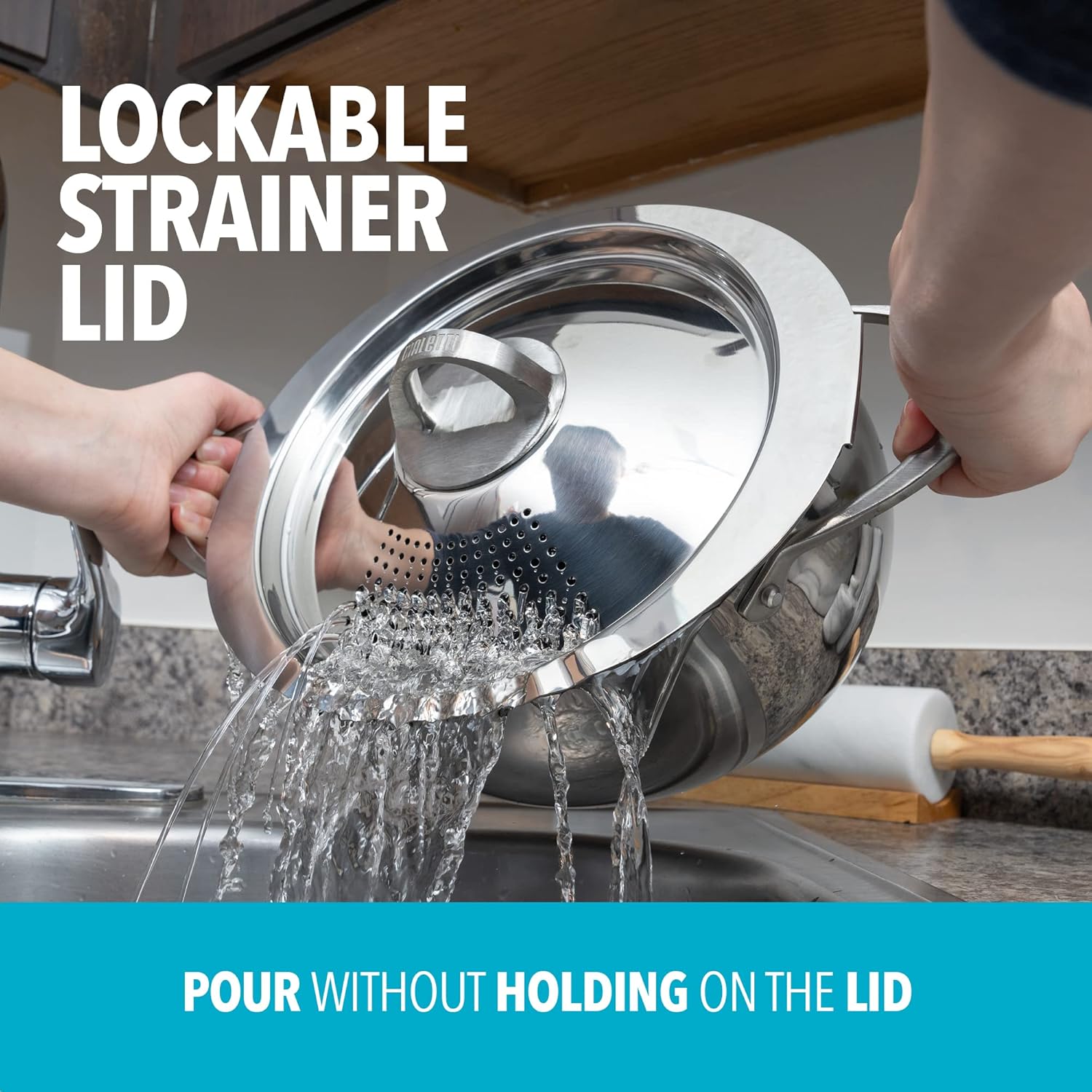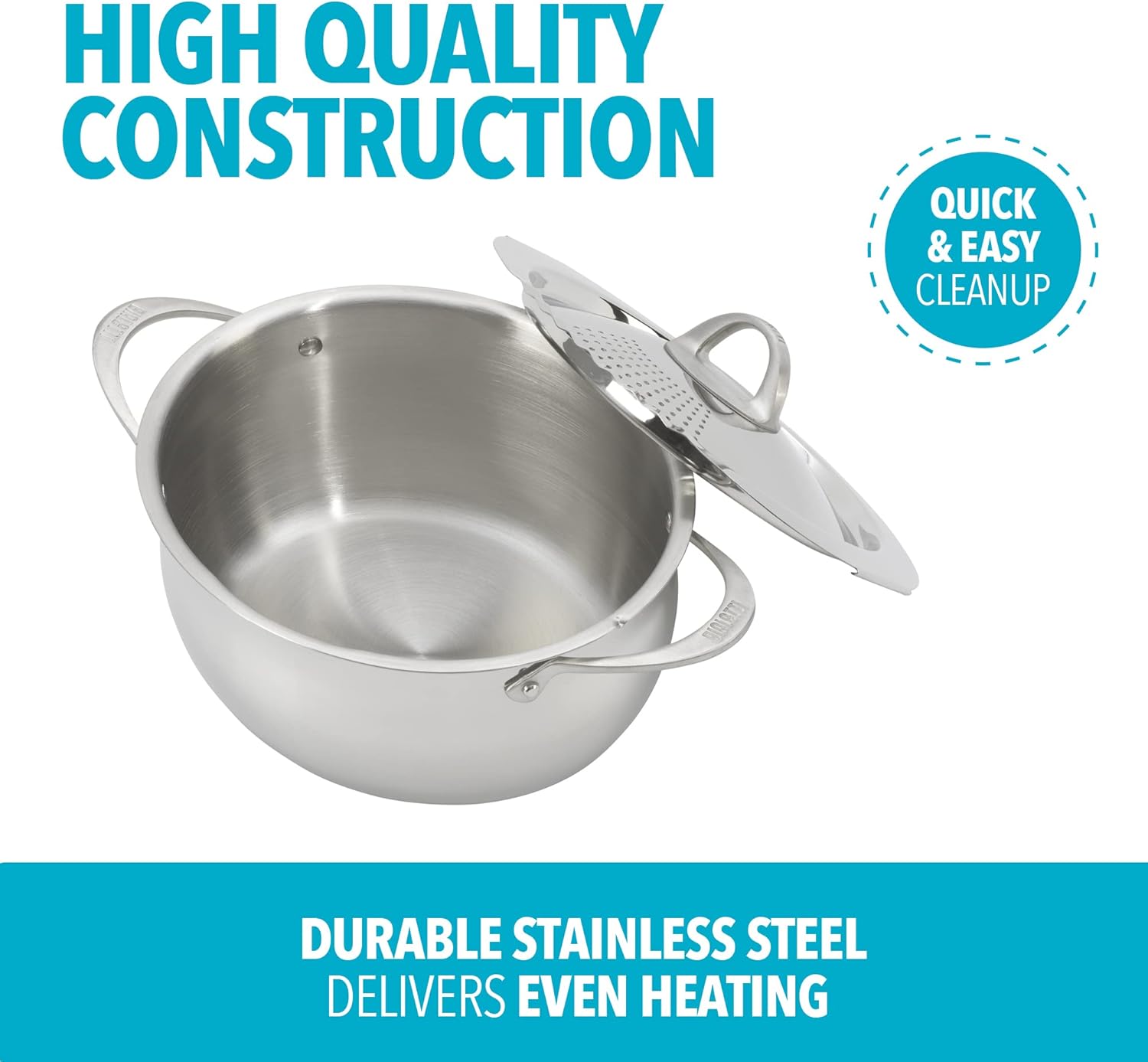 - STRAINER LID: Pot's lid twists and locks into place securely and features integrated straining holes for additional safety and convenience when draining excess water out of the pot