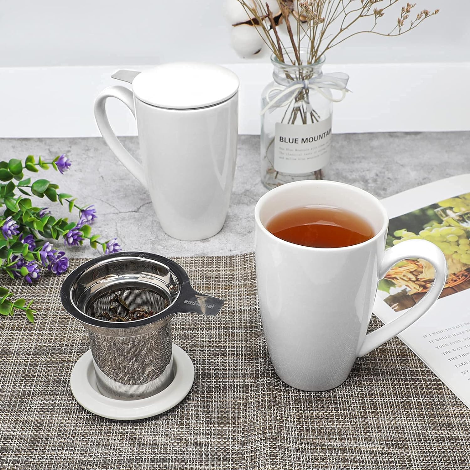 amhomel Porcelain Tea Mug with Infuser and Lid, 16 Ounce Ceramic Tea Cup for Loose Leaf, Coffee, Cocoa and Milk, Tea Gift for Tea Lovers, Set of 2(White)