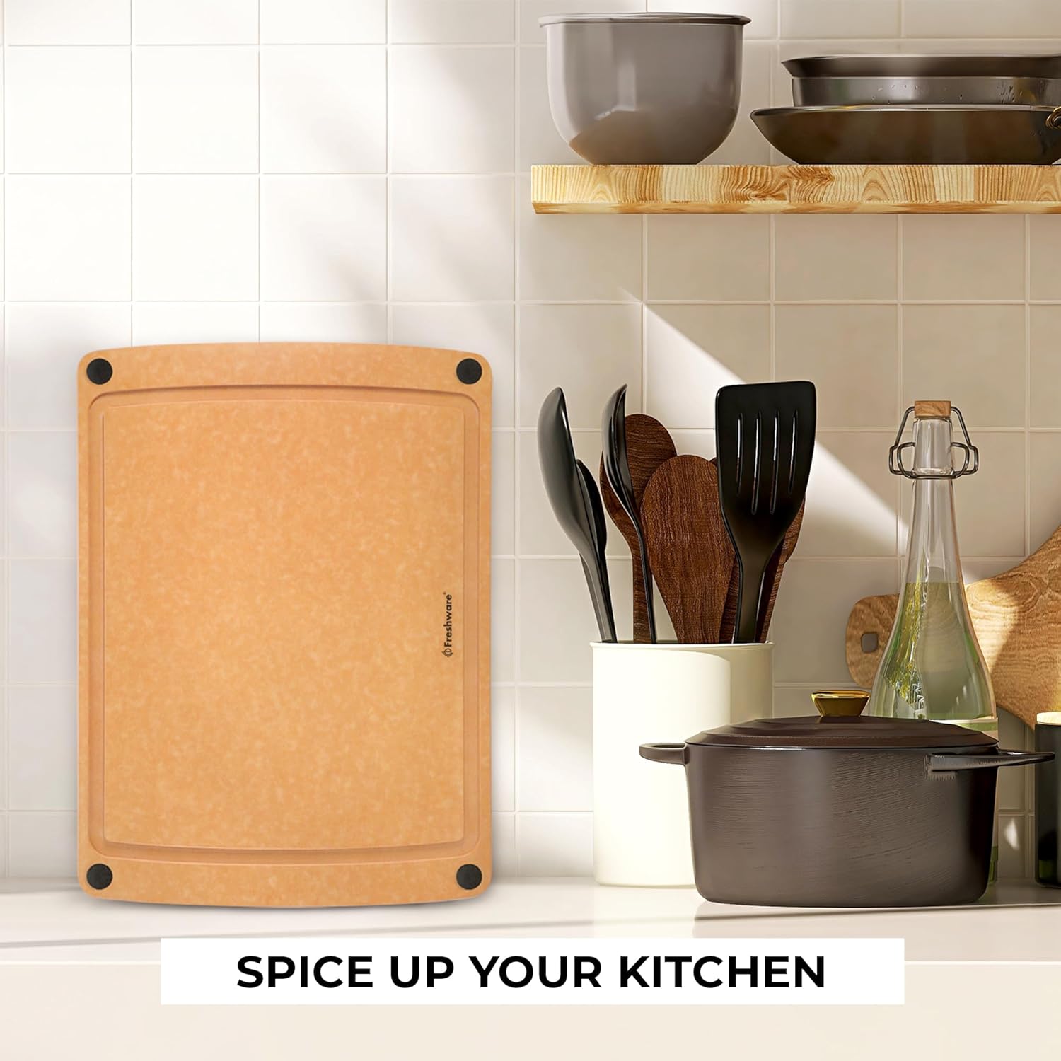- Easy To Clean and Dishwasher Safe: Medium 12" x 9" wood fiber cutting board, wooden natural color, juice groove, non-slip silicone feet, dual-sided cutting surface. If you are looking for a crafted wood cutting board that is extremely safe to use, then we got you covered. BPA-free, dishwasher safe, Freshware wood cutting boards provide a clean food prep surface for every meal.