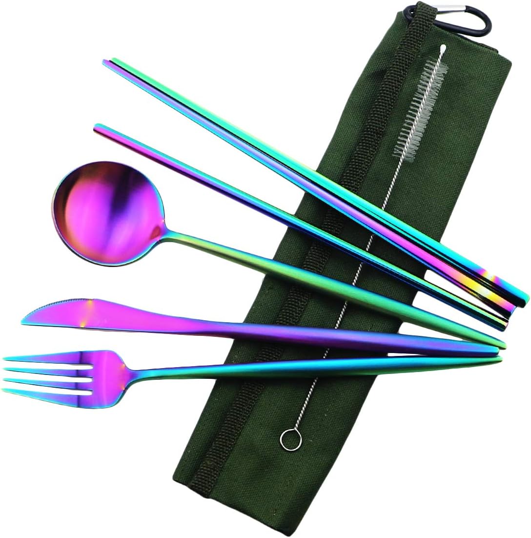 Gugrida Reusable Travel Utensils, 7 Piece Portable 304 Stainless Steel including Knife Fork Spoon Chopsticks Cleaning Brush Straws Portable Pouch, Eco-friendly Camping Silverware Set, Dishwasher Safe