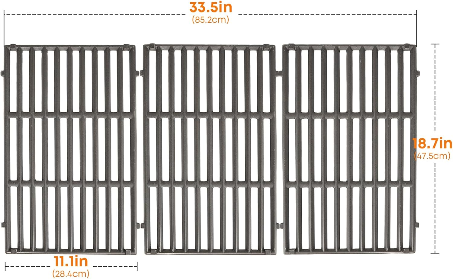 - 【DIMENSION & PACKAGE】18.74” x 11.12” for each grate, 18.74” x 33.36” for total. Comes with 3 cast iron cooking grates. Kindly compare with the SIZE and MODEL of your original parts before you order.