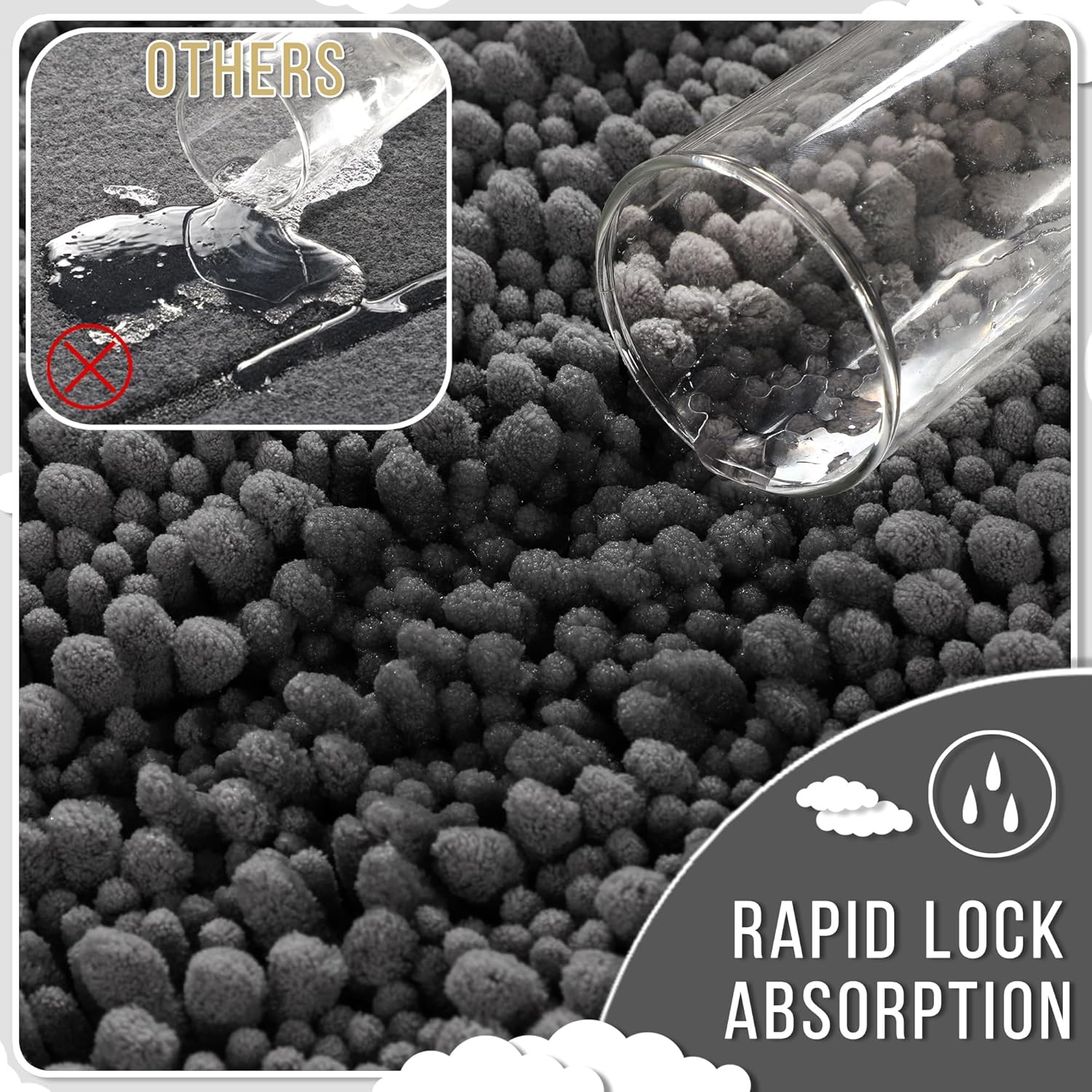 - Massive Water Absorption in Seconds: 5X faster than other materials mats, Yimobra bath mat absorbs 1000ml of water in 3 seconds. The vertical fiber channels lock moisture away from the surface, keeping your bathroom floor dry and discouraging damp environments. Perfect as a shower exit guard or sink splash catcher