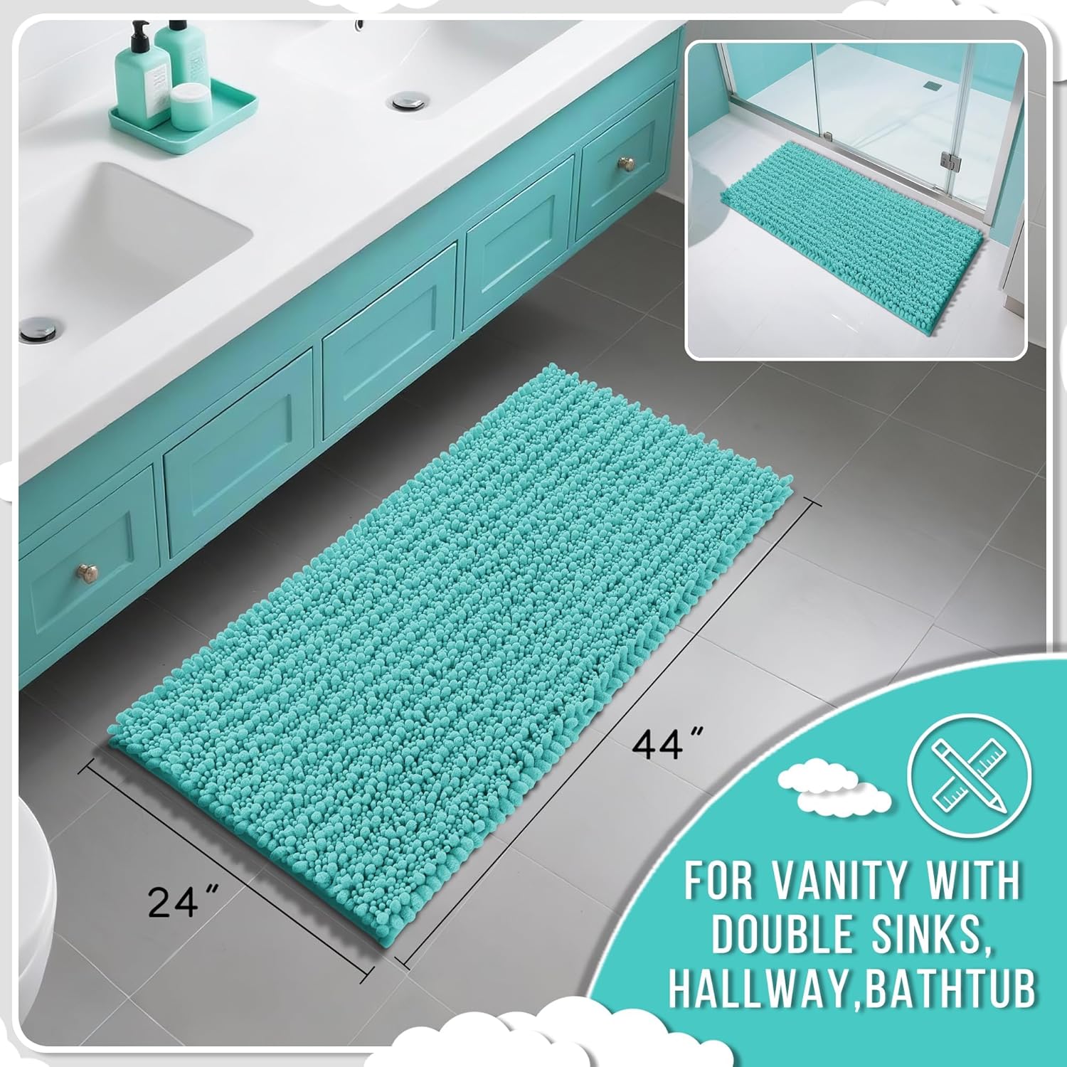 Yimobra Long Bathroom Rugs Non Slip Washable 44x24 Inch - Ultra Soft Absorbent Chenille Bath Mat, Quick Dry Shaggy Floor Carpet for Tub Shower, Lake Blue Home Decor Accessories