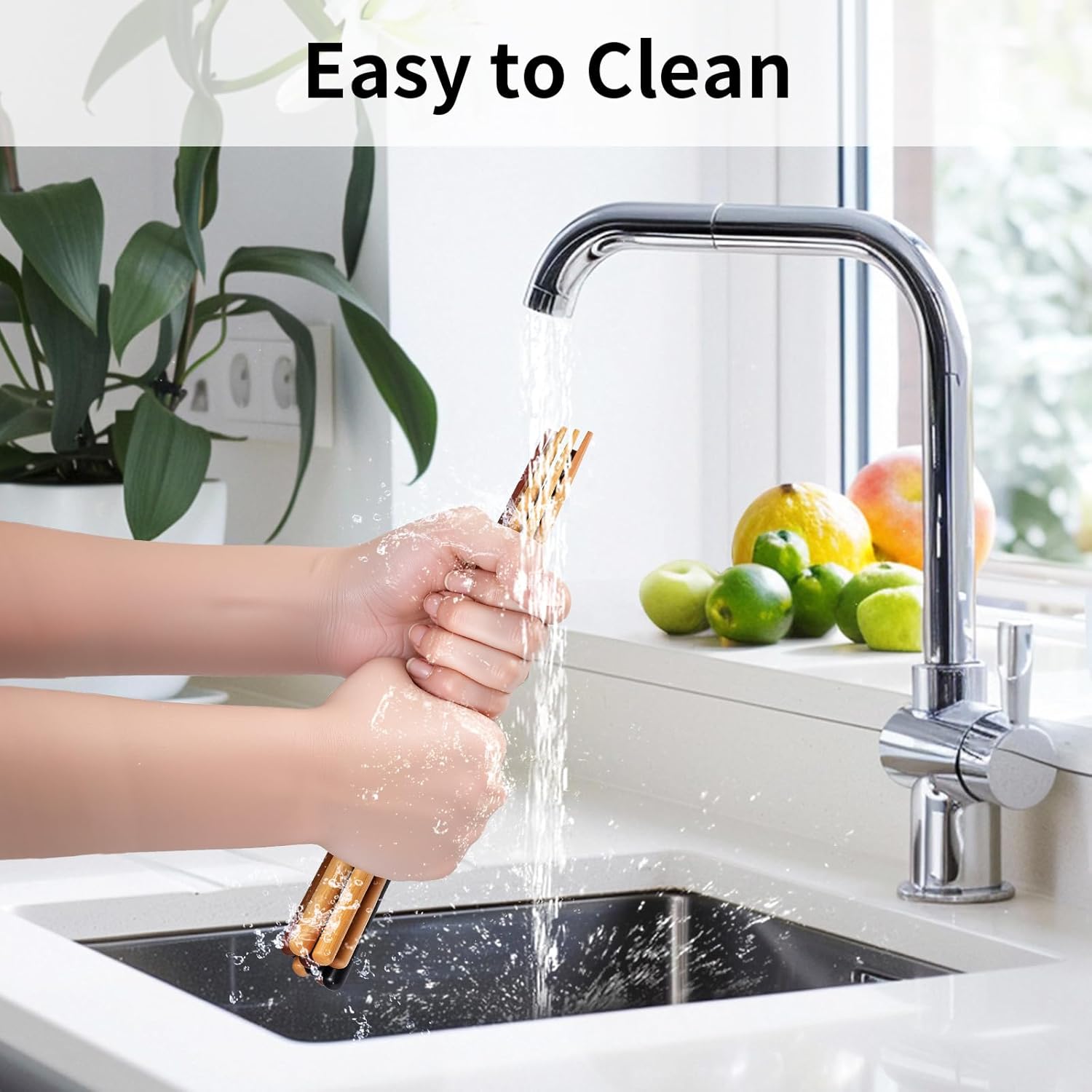 - Durable & Easy to Maintain: Coated with food-grade lacquer, these chopsticks have a smooth surface that resists wear and tear. The high-density natural wood construction ensures they remain stable, resistant to bending and cracking. Our wooden chopsticks easy to clean, simply wash with mild soap and water and can be reused for a long time.