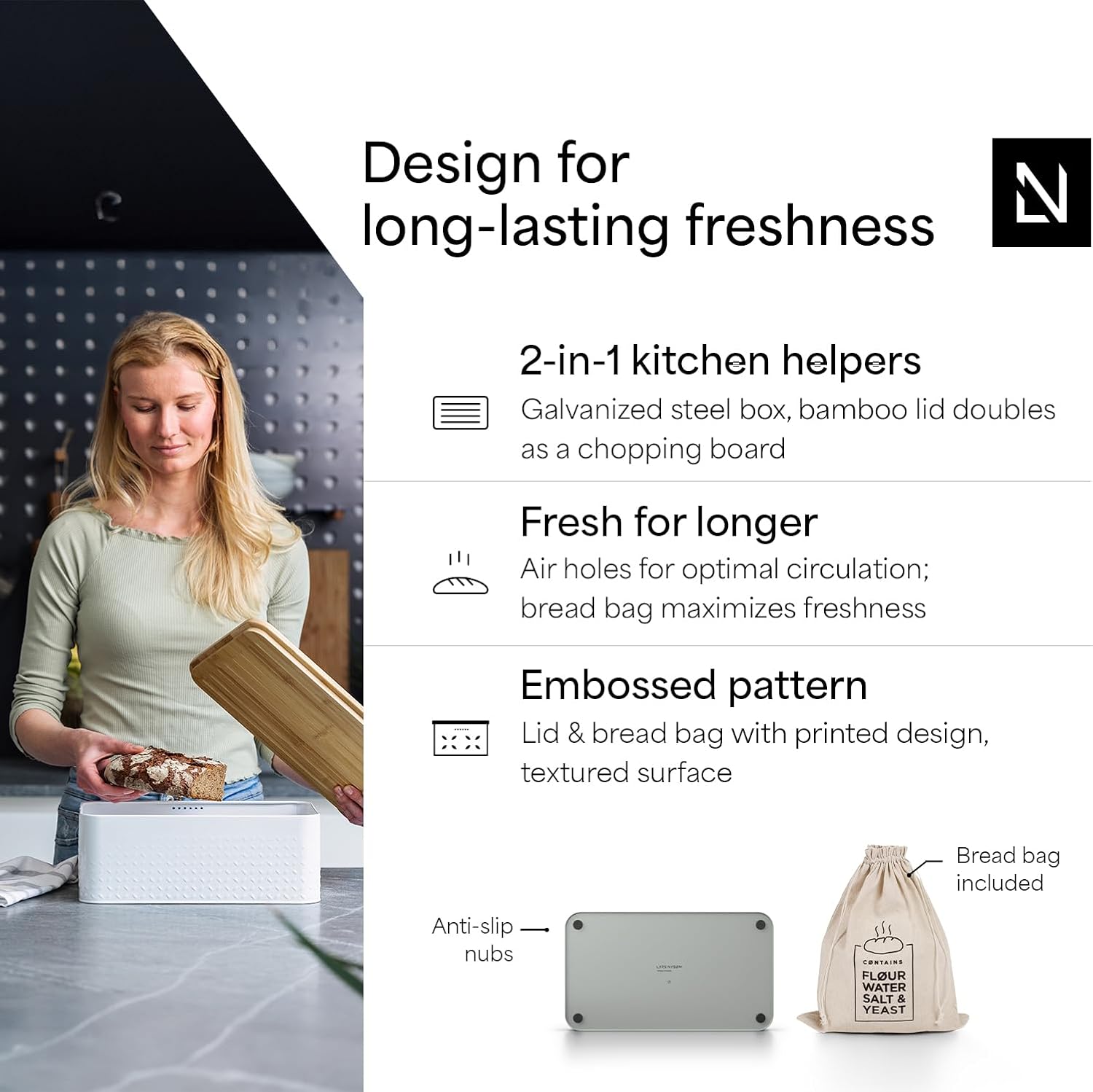 - MINIMALIST DESIGN: Our Bread Bin "Glæde" by LARS NYSØM is a minimalist piece for your kitchen and a real all-rounder that keeps your favorite pastries fresh for a long time. Perfect for storing bread, onion and potatoes. 13.4 x 7.3 x 5.3 In.