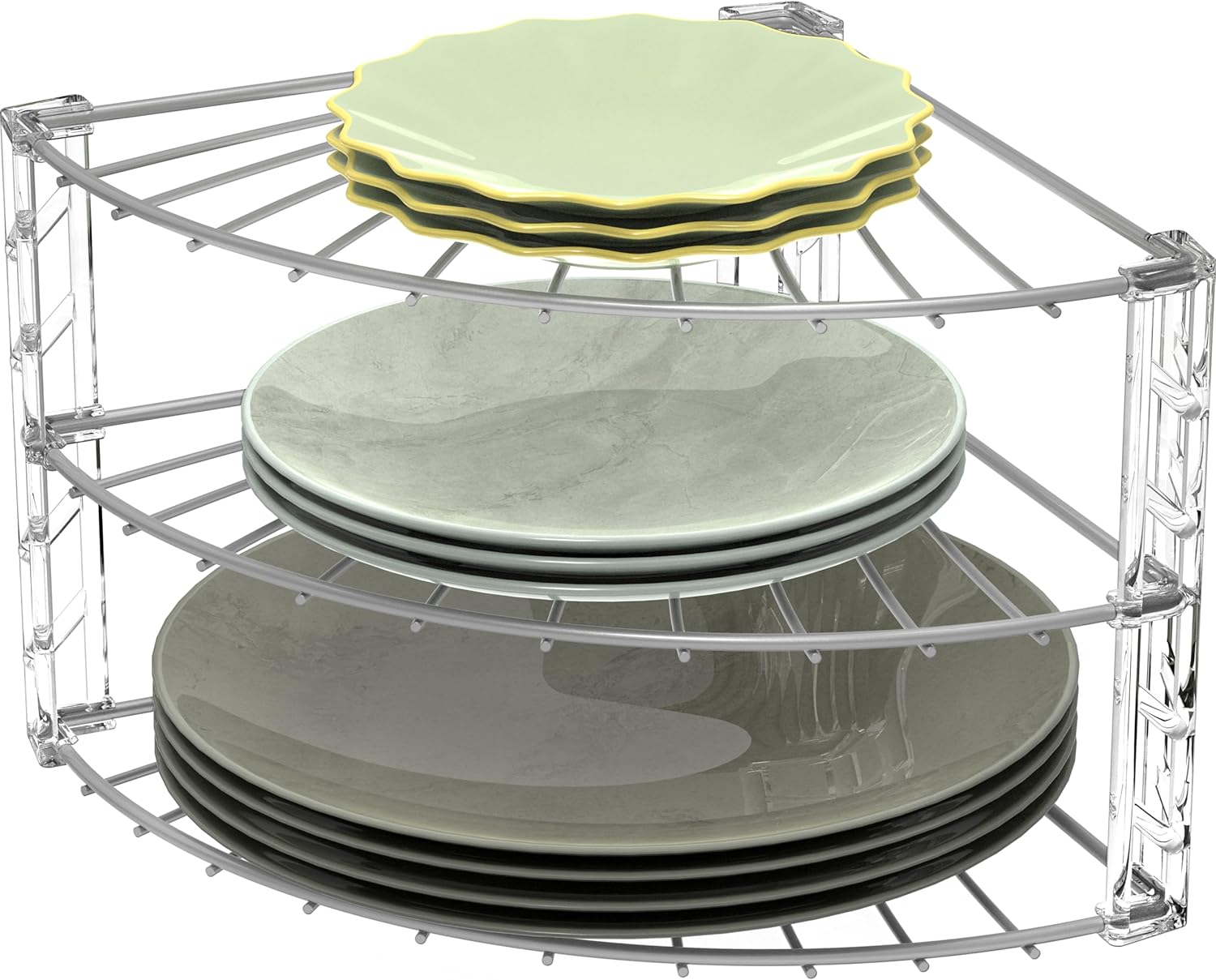 - 3 tier corner shelf to store pans, lids, and dishware on your counter or in your cabinet.