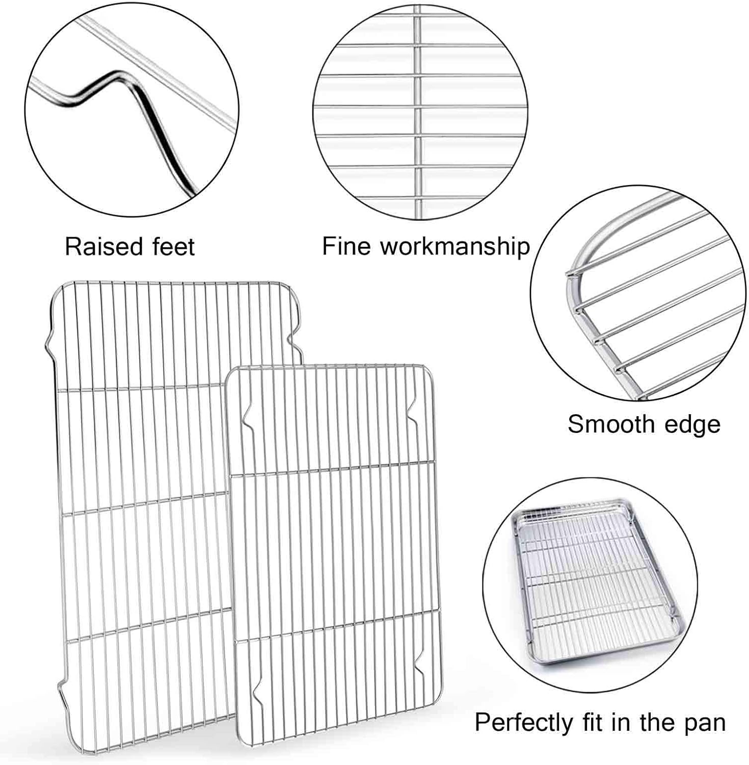 - MULTIFUNCTIONAL: The cookie pans and wire baking racks perfect for baking cookies / chicken / bacon, Roasting steaks /shrimp, Cooling bread / pizza / cupcake, Baking tray even ideal be a serving pan, An economical choice for family baking